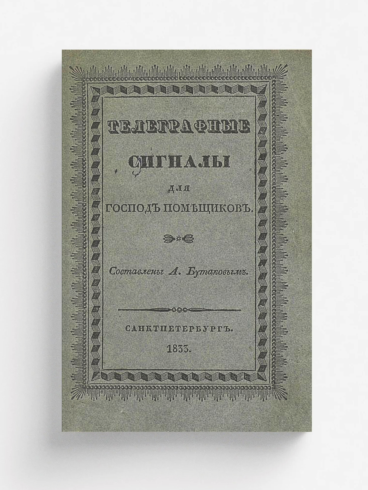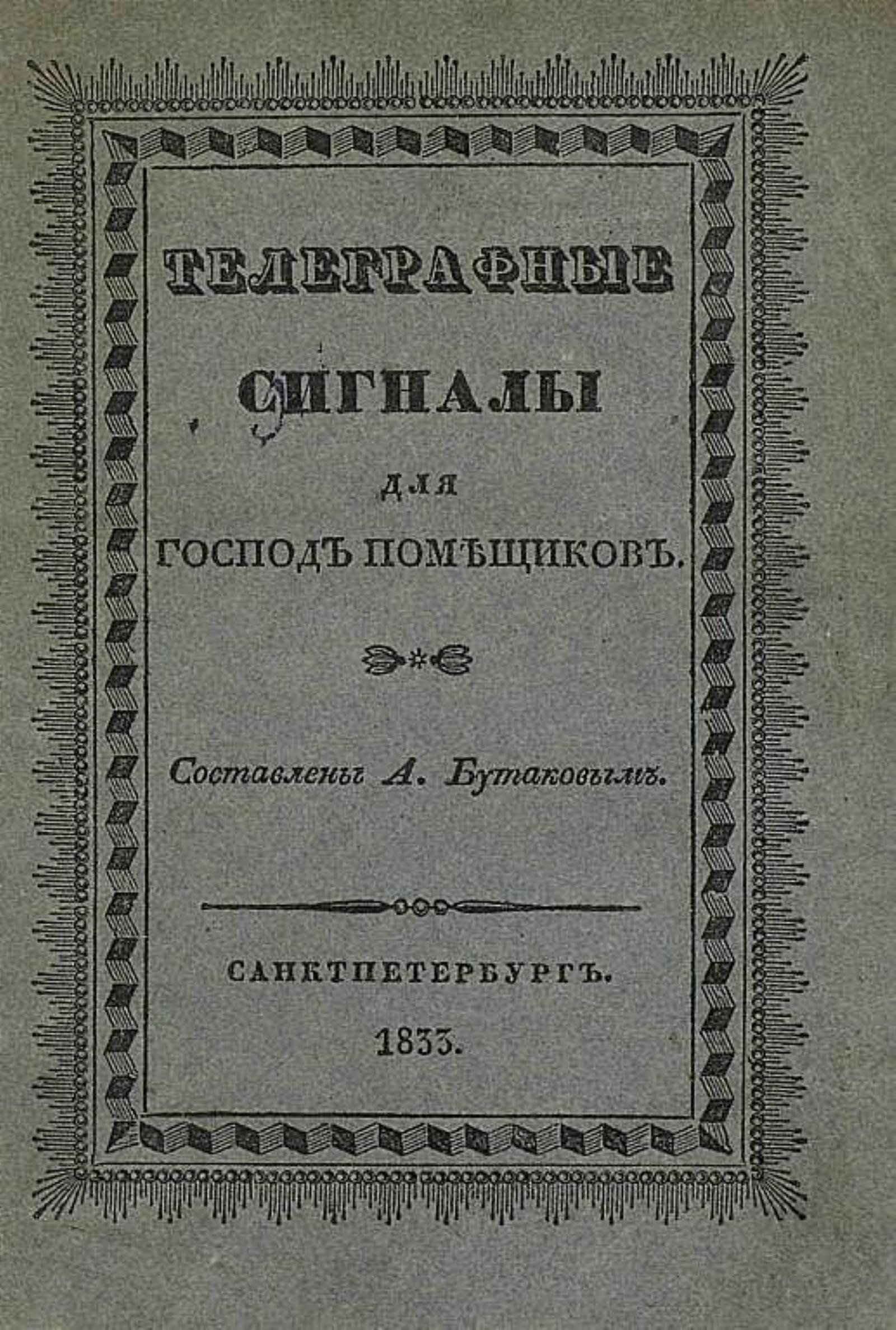 Бутаков, Александр. Телеграфные сигналы для господ помещиков / Сост. А. Бутаковым. — Санкт-Петербург : тип. Врем. деп. воен. поселений, 1833. — 12 с., 1 л. ил.; 15.