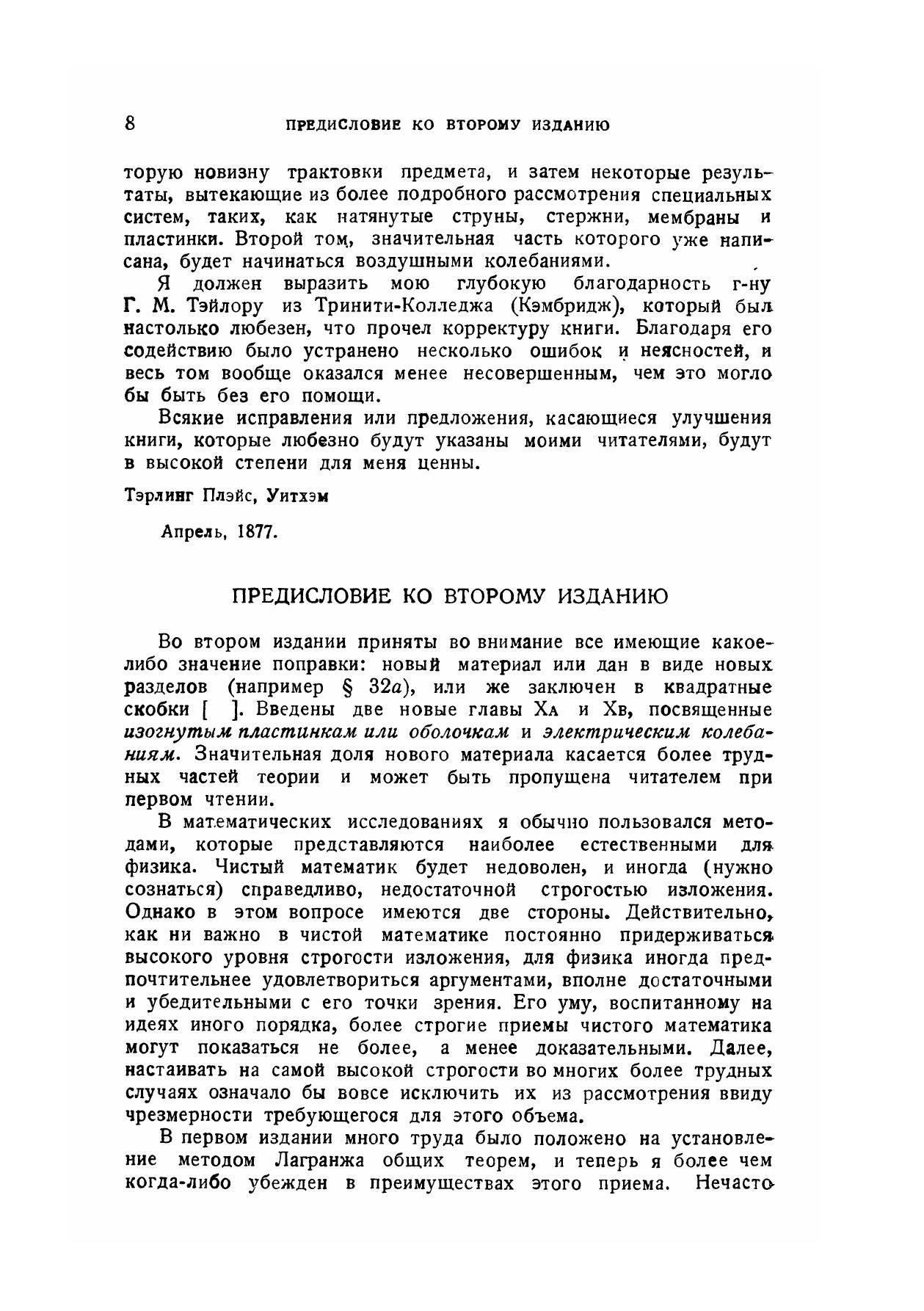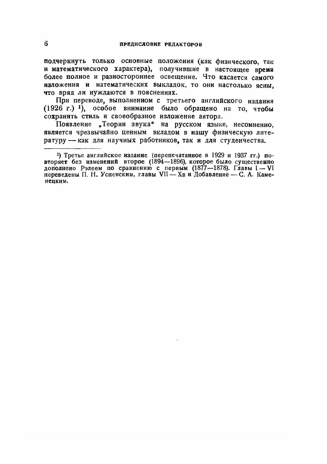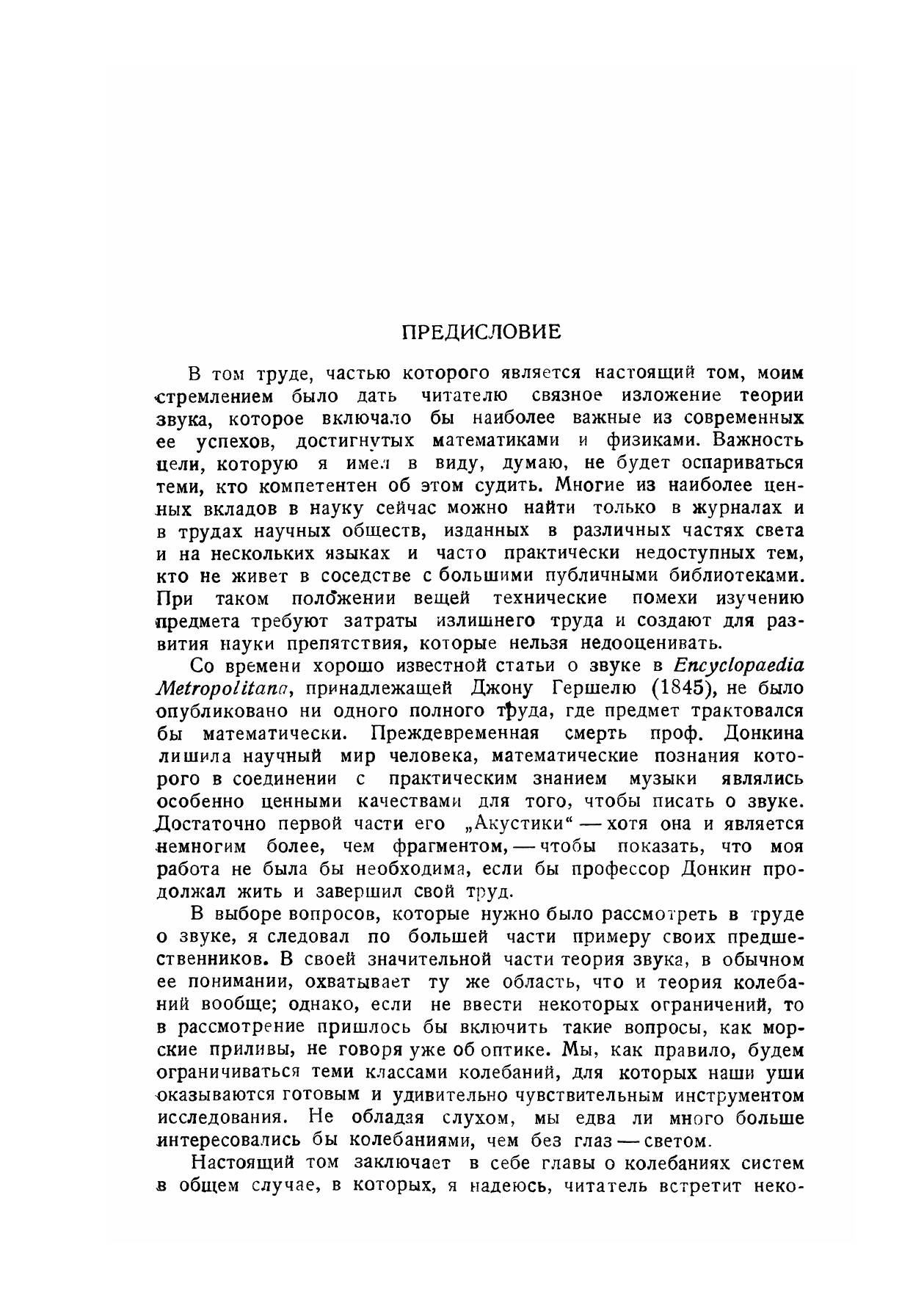 „Теория звука" Джона Вильяма Стрэтта (лорда Рэлея) представляет собой классический труд, отличающийся, как и все работы этого великого ученого, исключительной глубиной и полнотой изложения. Работы Рэлея и, в частности, его „Теория звука" отнюдь не принадлежат к тем классическим произведениям, которые в свое время были актуальны и важны, но в наши дни сохранили только исторический интерес. „Теория звука", изданная впервые в 1878 г., является и теперь настольной книгой для всех, кто работает не только в области акустики, но и в любой области физики, имеющей дело с колебаниями.