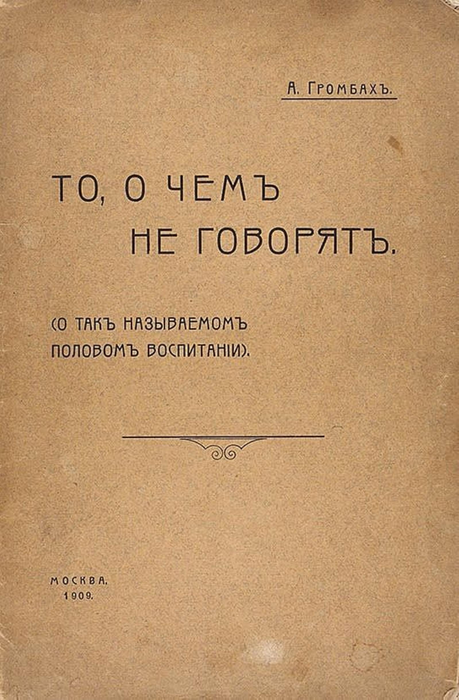 Громбах, Александр Анисимович. То, о чем не говорят : (О так называемом половом воспитании) / А. Громбах. — Москва : тип. А. П. Поплавского, 1909. — VIII, 76 с.; 22.
