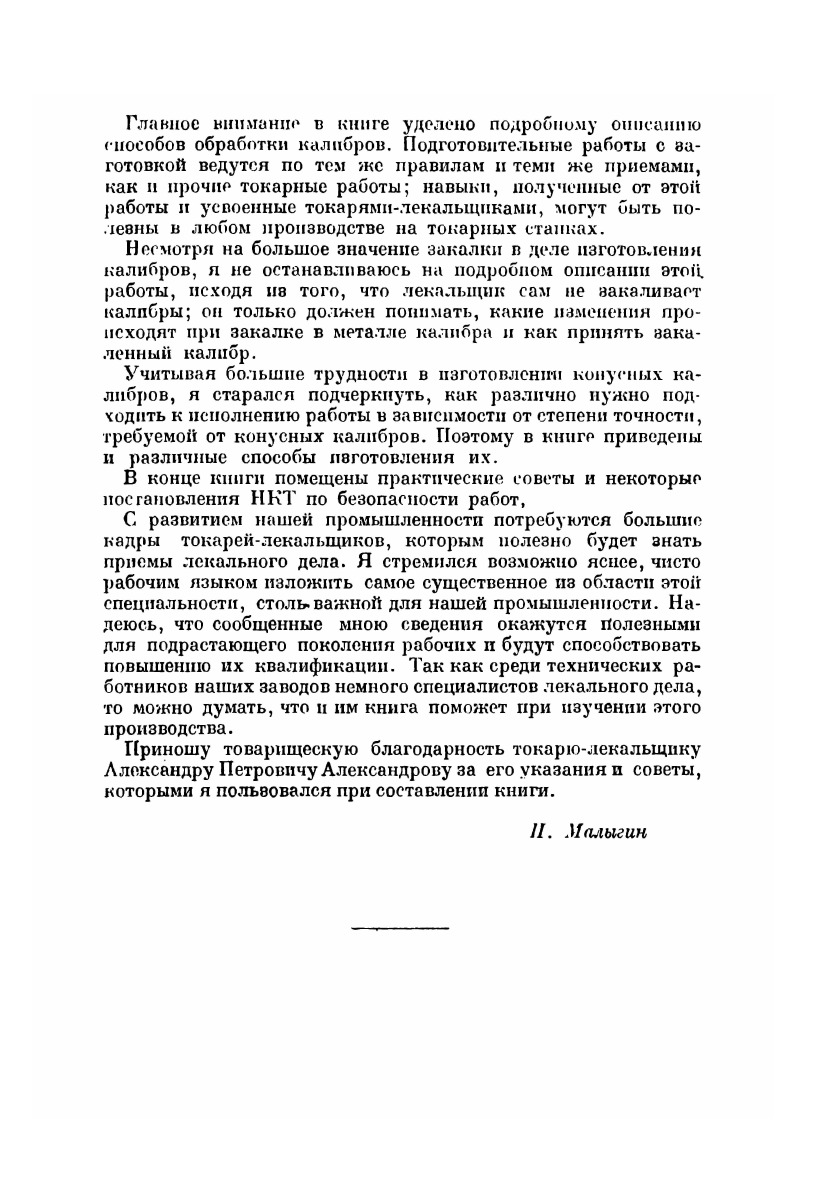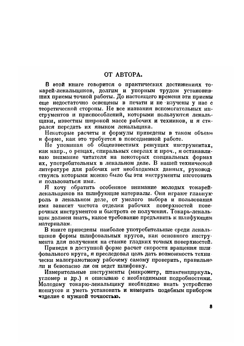 С развитием нашей промышленности потребуются большие кадры токарей-лекальщиков, которым полезно будет знать приемы лекального дела. В этой книге говорится о практических достижениях токарей-лекальщиков, долгим и упорным трудом установивших приемы точной работы. До настоящего времени эти приемы еще недостаточно освещены в печати и не изучены у нас с теоретической стороны. Не все названия вспомогательных инструментов и приспособлений, которыми пользуются лекальщики, известны широкой массе рабочих и техников, и автор старался передать их языком лекальщика.