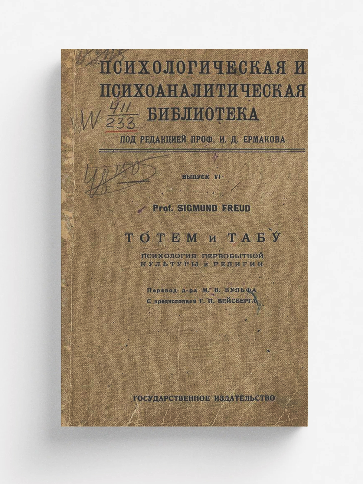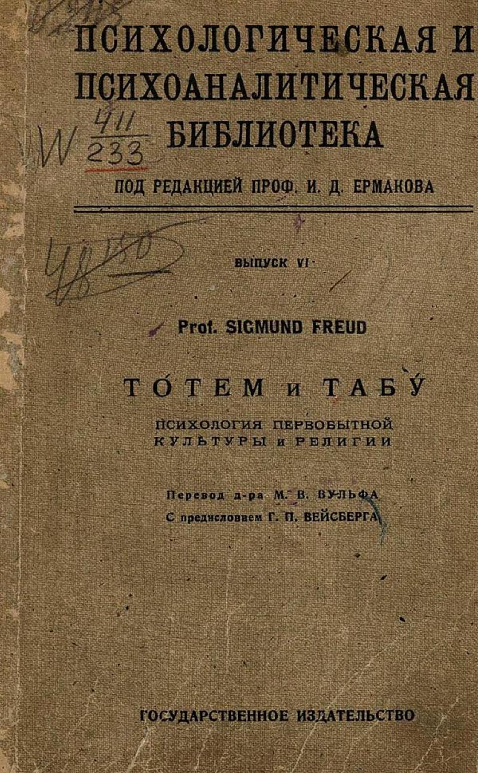 Фрейд, Зигмунд. Тотем и табу : психология первобытной культуры и религии / Sigmund Freud ; перевод М. В. Вульфа с предисловием Г. П. Вейсберга. — Москва ; Петроград : Гос. изд-во, 1923. — 170, [1] с.; 23 см. — (Психологическая и психоаналитическая библиотека / под редакцией профессора И. Д. Ермакова; вып. 6).