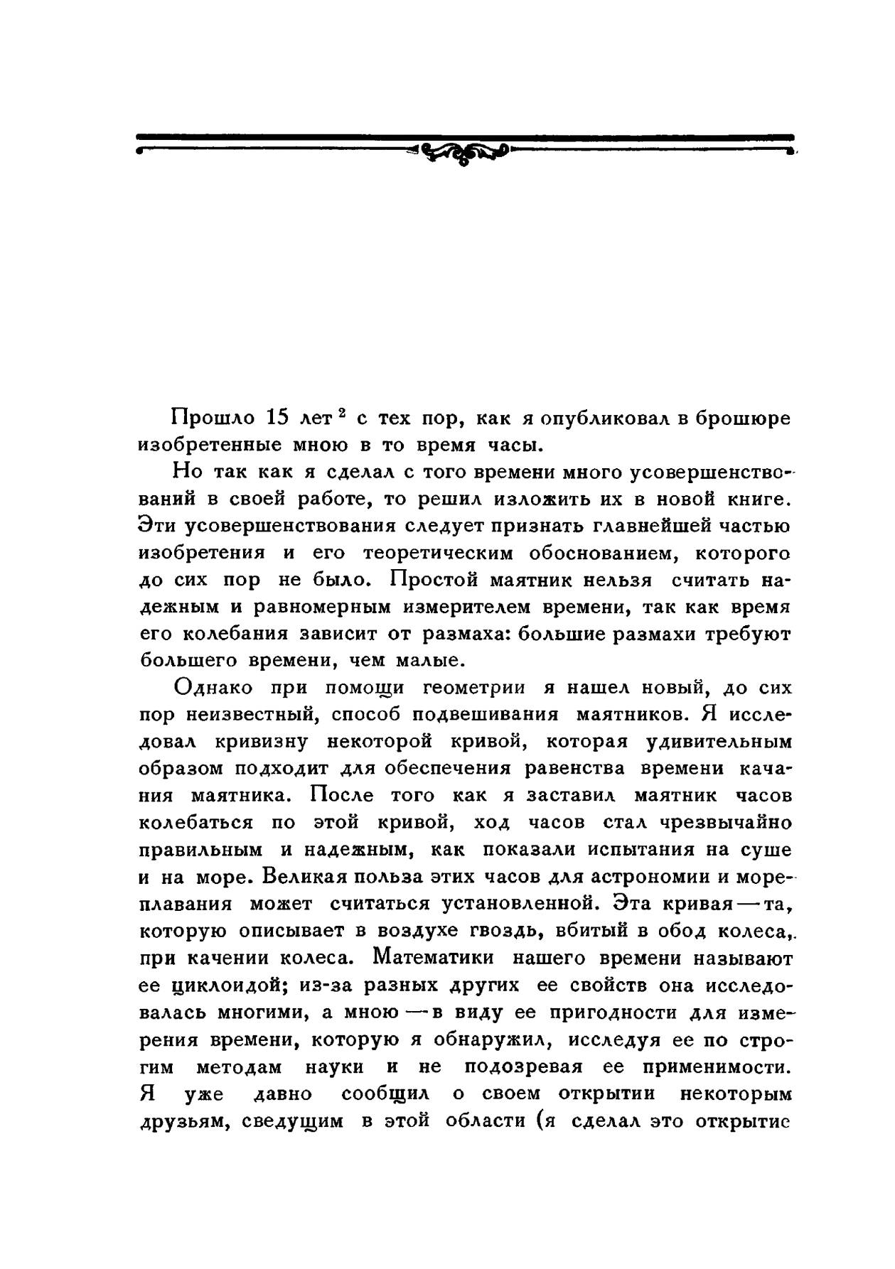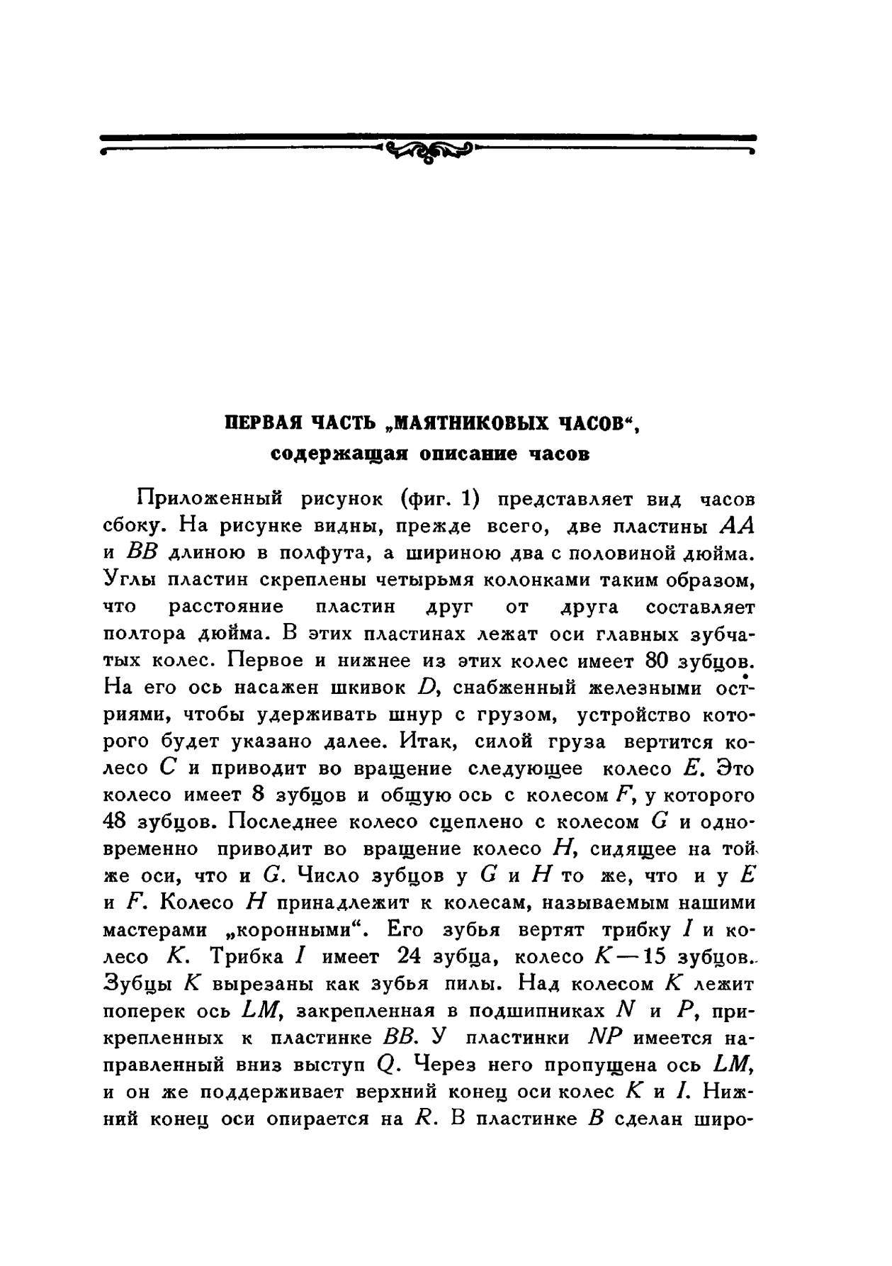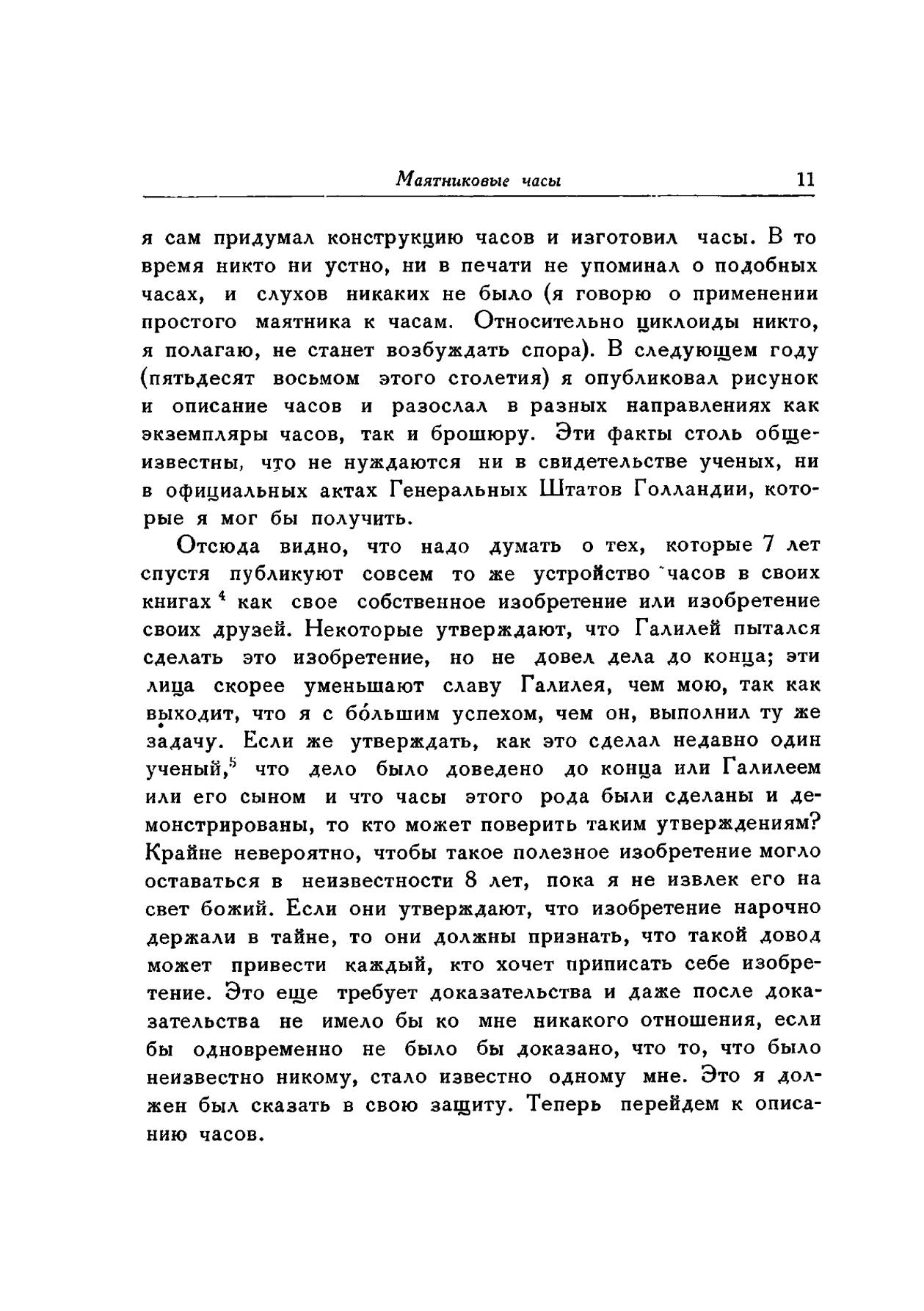 В издание вошли три мемуара Христиана Гюйгенса по механике: «Маятниковые часы» (1673 г.), «О движении тел под влиянием удара» и «О центробежной силе» (1703 г.) К наиболее выдающимся работам Гюйгенса следует отнести изобретение маятниковых часов. В 1657 г. он получил патент на это изобретение, а в 1658 г. описал их в небольшой брошюре «Маятниковые часы». Второе издание этой работы, но значительно расширенное, появилось в 1673 г. Особенность маятниковых часов Гюйгенса состояла в том, что падение гирь в них было равномерным и колебания маятника не затухали в течение длительного времени благодаря применению оригинального приспособления, так называемого «спуска», поддерживающего равномерные колебания.