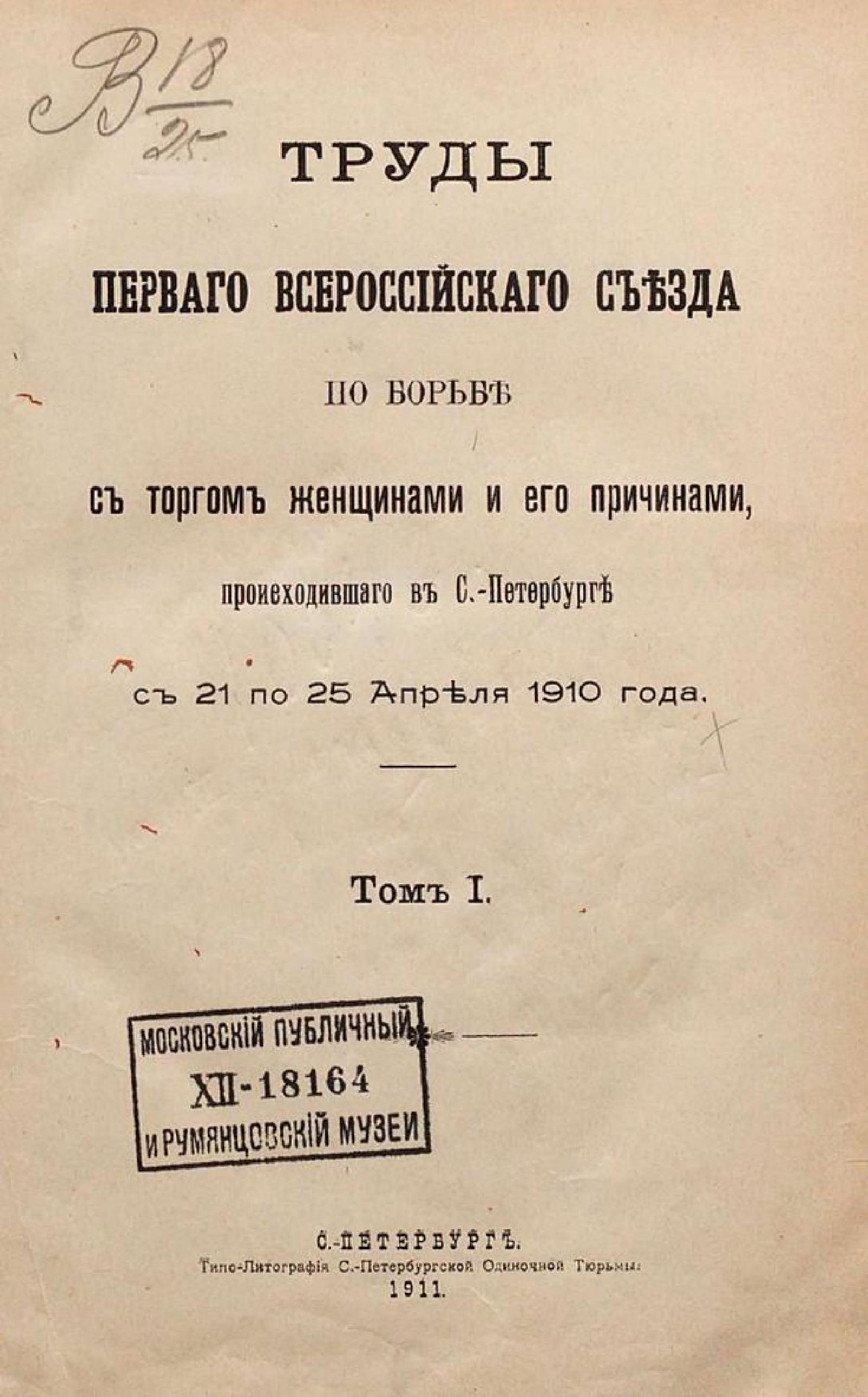 Труды Первого Всероссийского съезда по борьбе с торгом женщинами и его причинами, происходившего в С.-Петербурге с 21 по 25 апреля 1910 года : Т. 1—2. — Санкт-Петербург, 1911—1912. — 2 т.; 26. Т. 1. — 1911. — X, 334 с.
