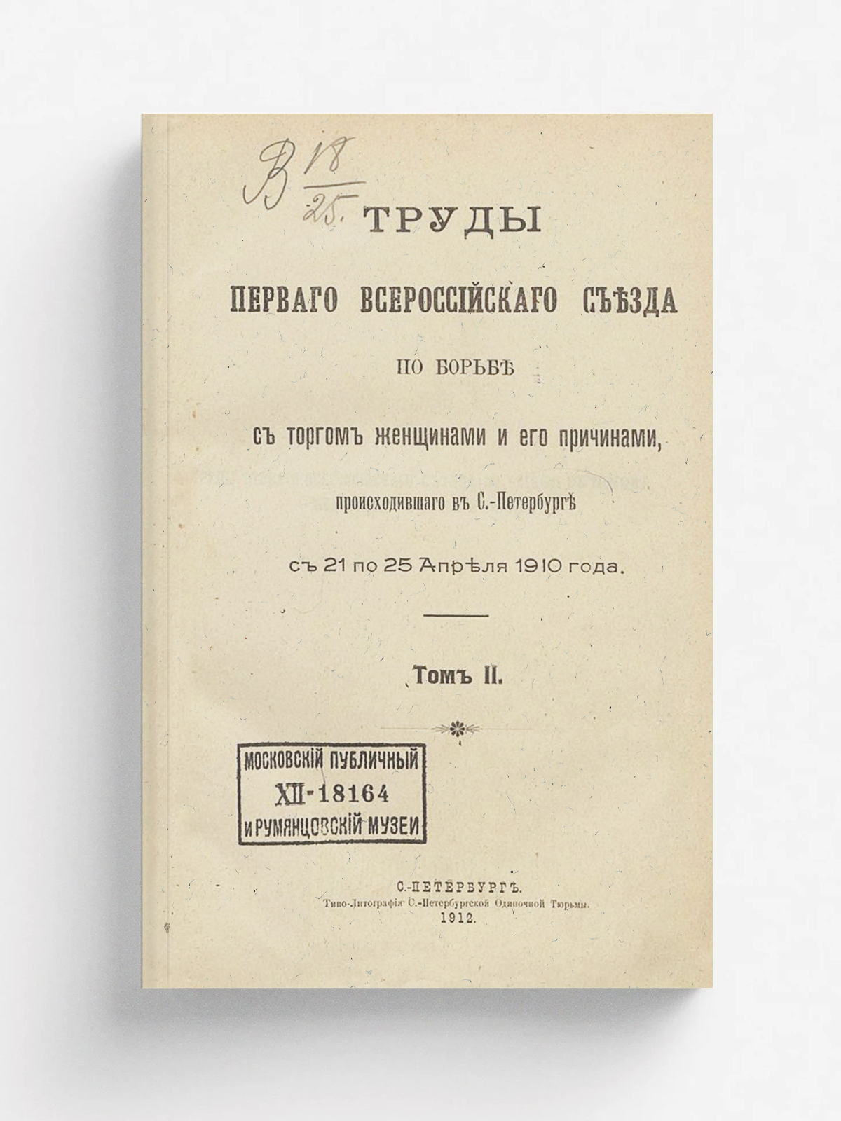 Труды Первого Всероссийского съезда по борьбе с торгом женщинами и его причинами, происходившего в С.-Петербурге с 21 по 25 апреля 1910 года : Т. 1—2. — Санкт-Петербург, 1911—1912. — 2 т.; 26. Т. 2. — 1912. — X, 335—624 с.