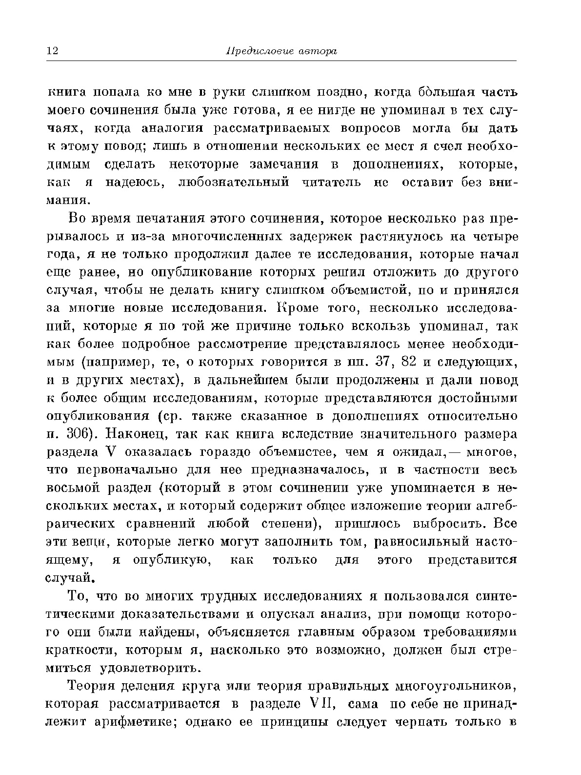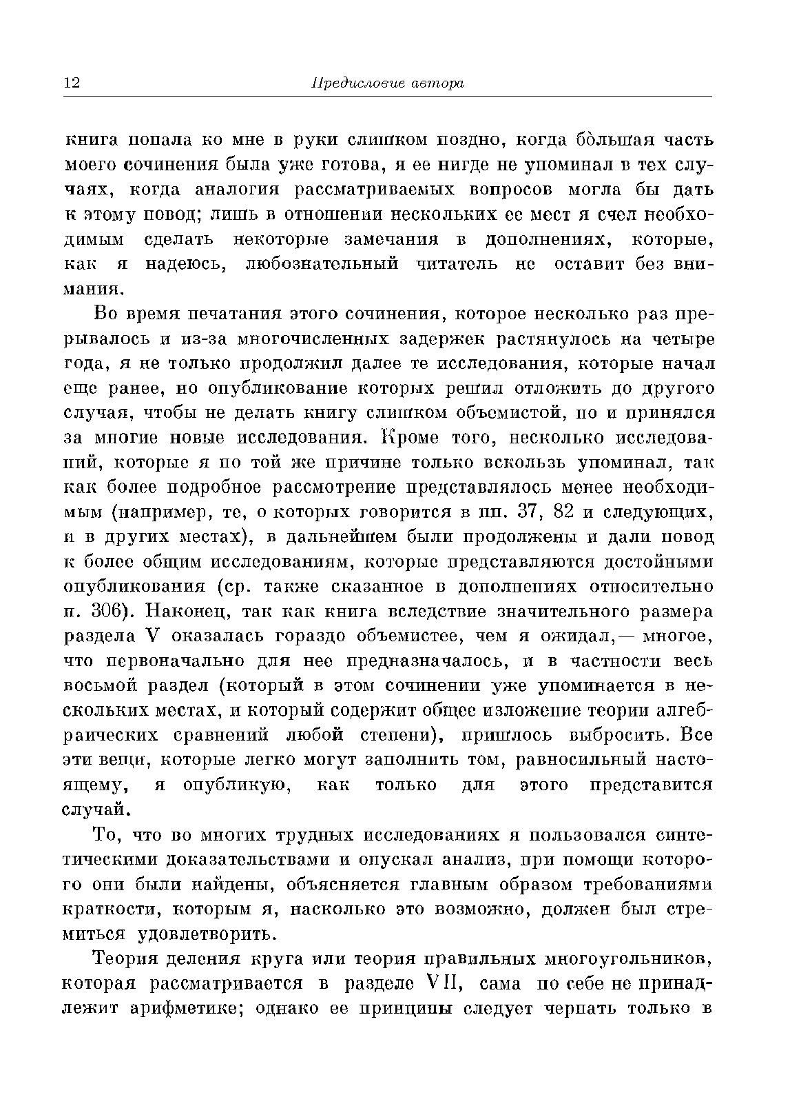 Почти все работы великого математика Гаусса были опубликованы им на латинском языке. В настоящем издании впервые публикуются в русском переводе все работы Гаусса по теории чисел. Перевод выполнен кандидатом физико-математических наук В. Б. Демьяновым в основном с прекрасного немецкого перевода Мазера, но некоторые места перевода были, кроме того, сверены членом-корреспондентом АН СССР Б. Н. Делоне с подлинным латинским текстом. В "Приложениях" даны статьи академика И. М. Виноградова "Карл Фридрих Гаусс" и статья-комментарий Б. Н. Делоне "Работы Гаусса по теории чисел", облегчающие чтение текста работ Гаусса.