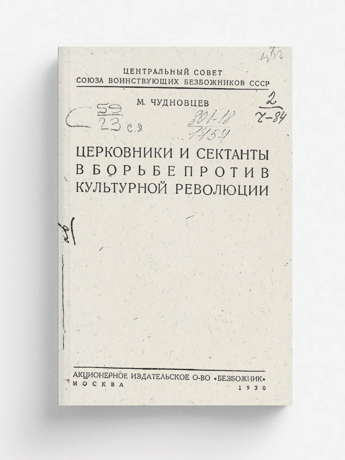 Чудновцев, Мирон Исаакович. Церковники и сектанты в борьбе против культурной революции / М. Чудновцев ; Центр. совет Союза воинствующих безбожников СССР. — Москва : акц. изд-ское о-во «Безбожник», 1930 (Л. : гос. тип. им. Евг. Соколовой). — 108 с., [3] с. объявл.; 23?15 см.