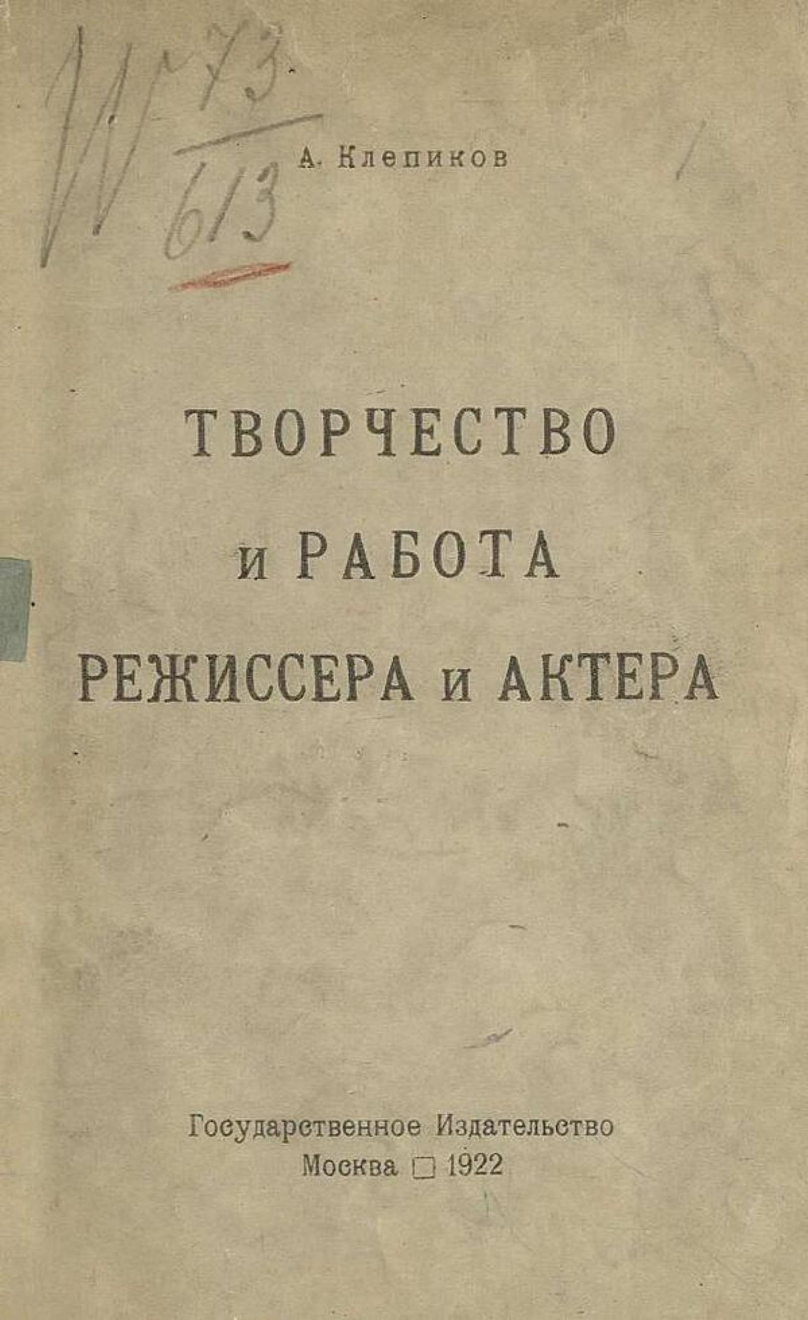 Клепиков, Александр Константинович. Творчество и работа режиссера и актера / А. Клепиков. — Москва : Гос. изд-во, 1922. — 47 с.; 20 см.