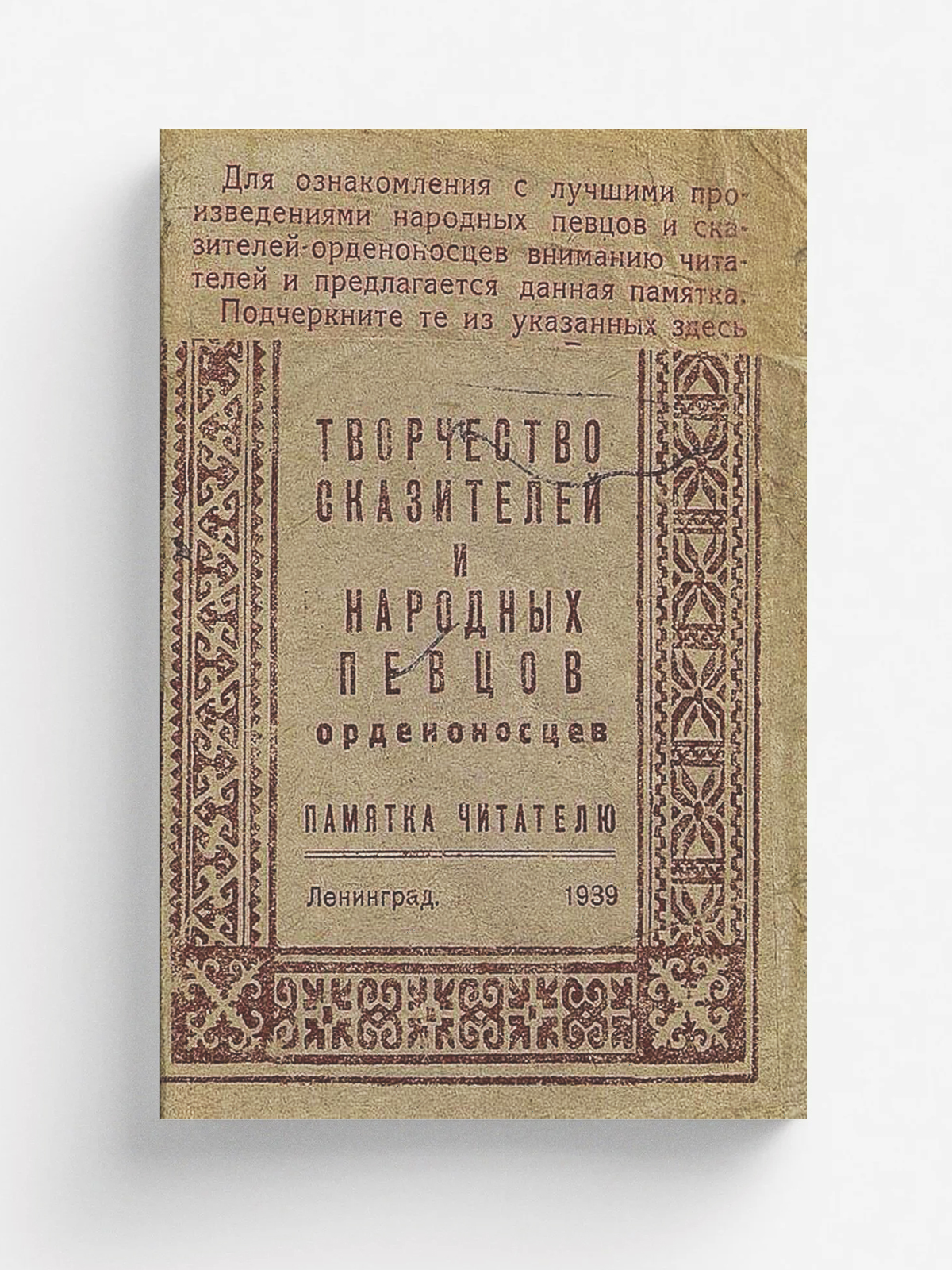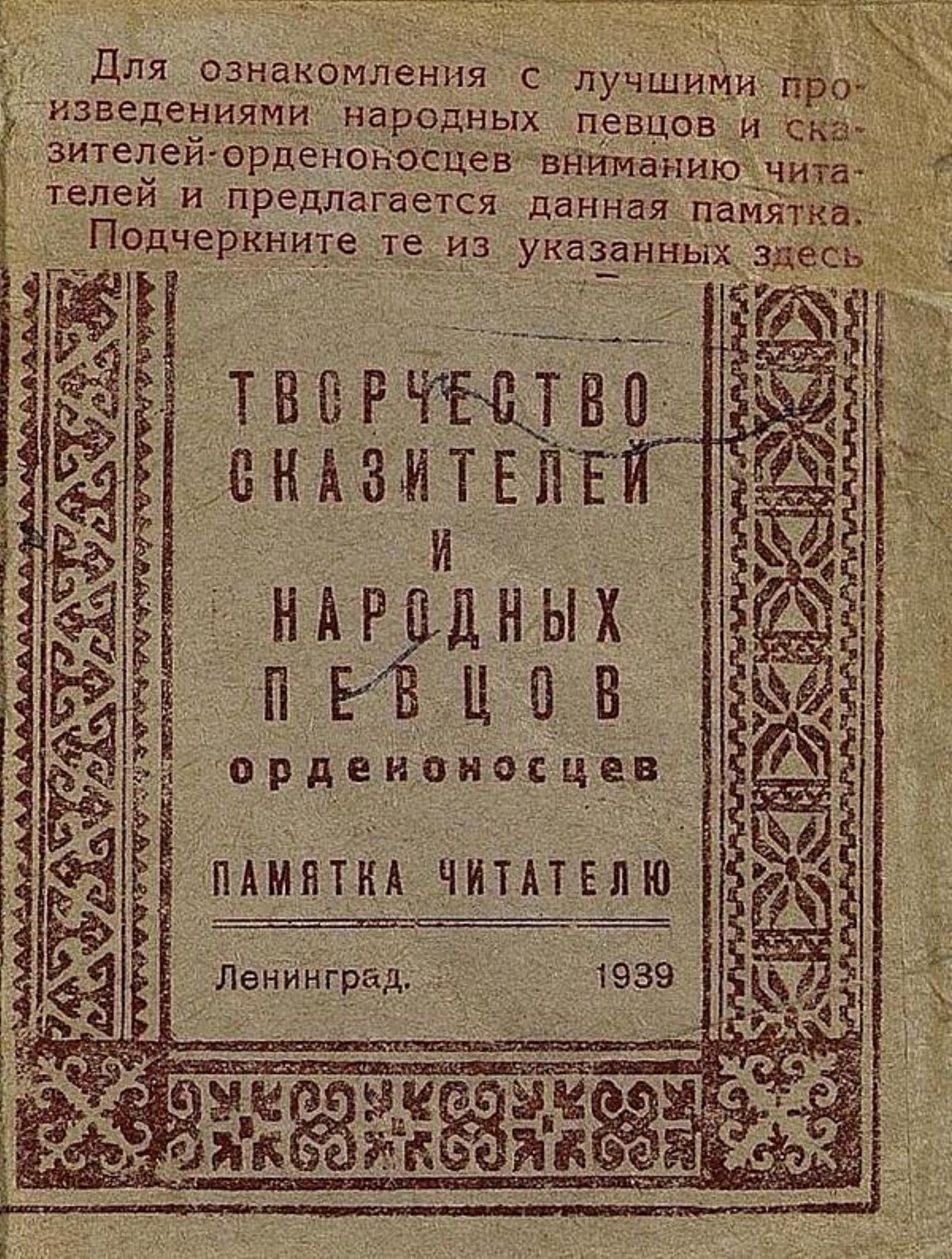 Творчество сказателей и народных певцов орденоносцев [Текст] : Памятка читателю. — Ленинград : Библиот. методбаза Ленгороно, 1939. — 16 с., без обл.; 12 см.