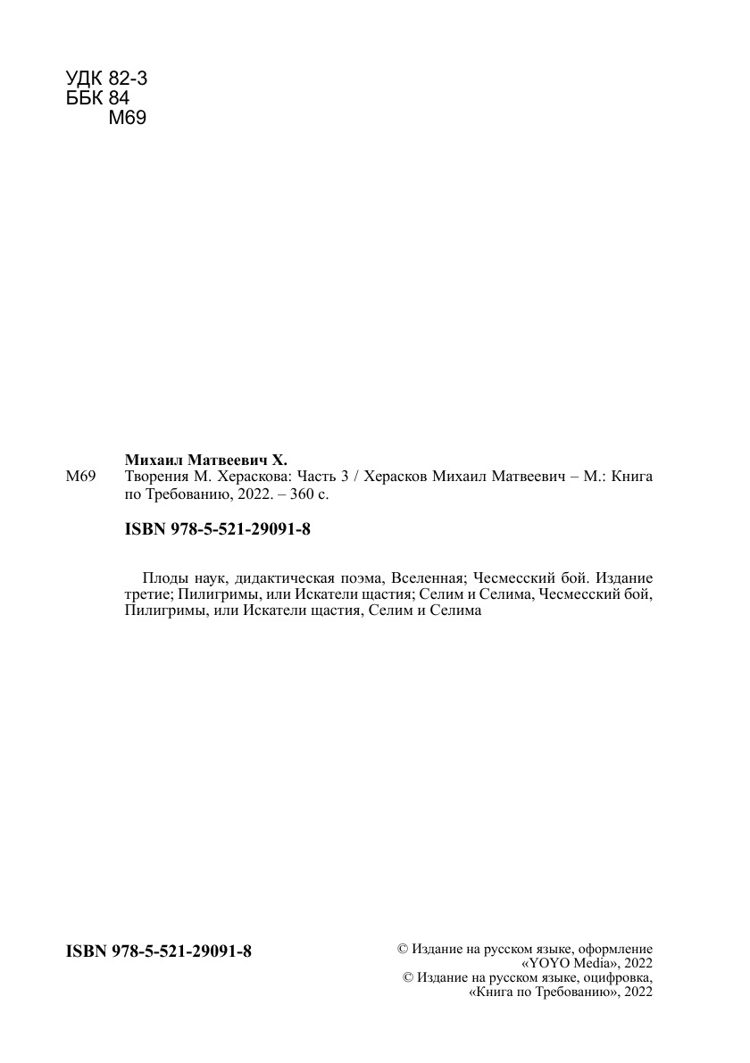 Печатная книга «Творения М. Хераскова, Часть 3» в мягкой обложке, язык - русский. В книге 360 страниц, она напечатана на белой офсетной бумаге плотностью 80 г/м². Формат издания — 148x210 мм. Все книги аккуратно упаковываем в прочный трёхслойный непрозрачный картонный конверт.