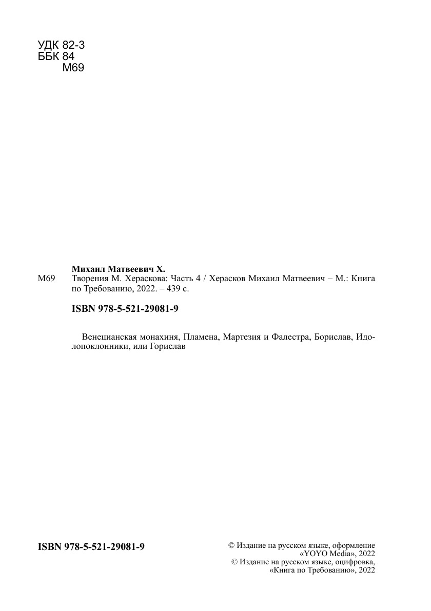 Печатная книга «Творения М. Хераскова, Часть 4» в мягкой обложке, язык - русский. В книге 439 страниц, она напечатана на белой офсетной бумаге плотностью 80 г/м². Формат издания — 148x210 мм. Все книги аккуратно упаковываем в прочный трёхслойный непрозрачный картонный конверт.