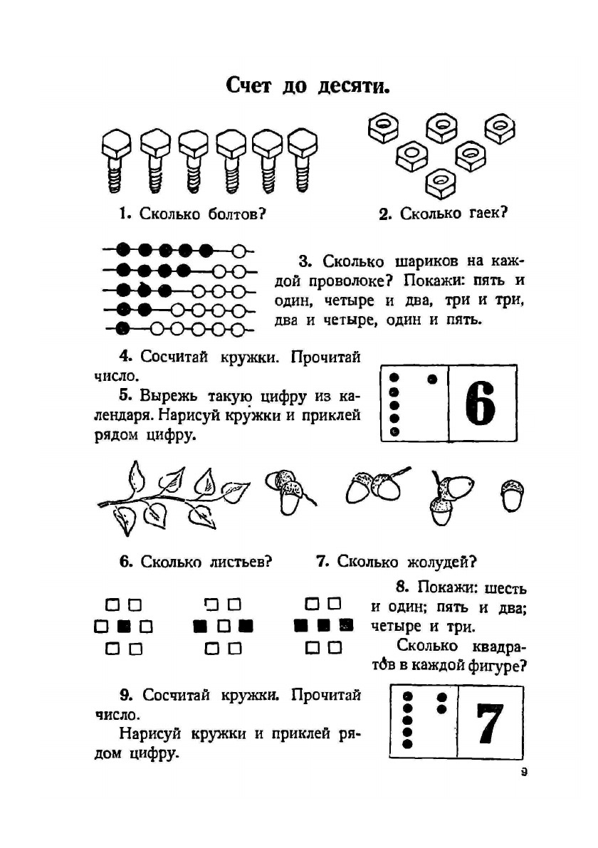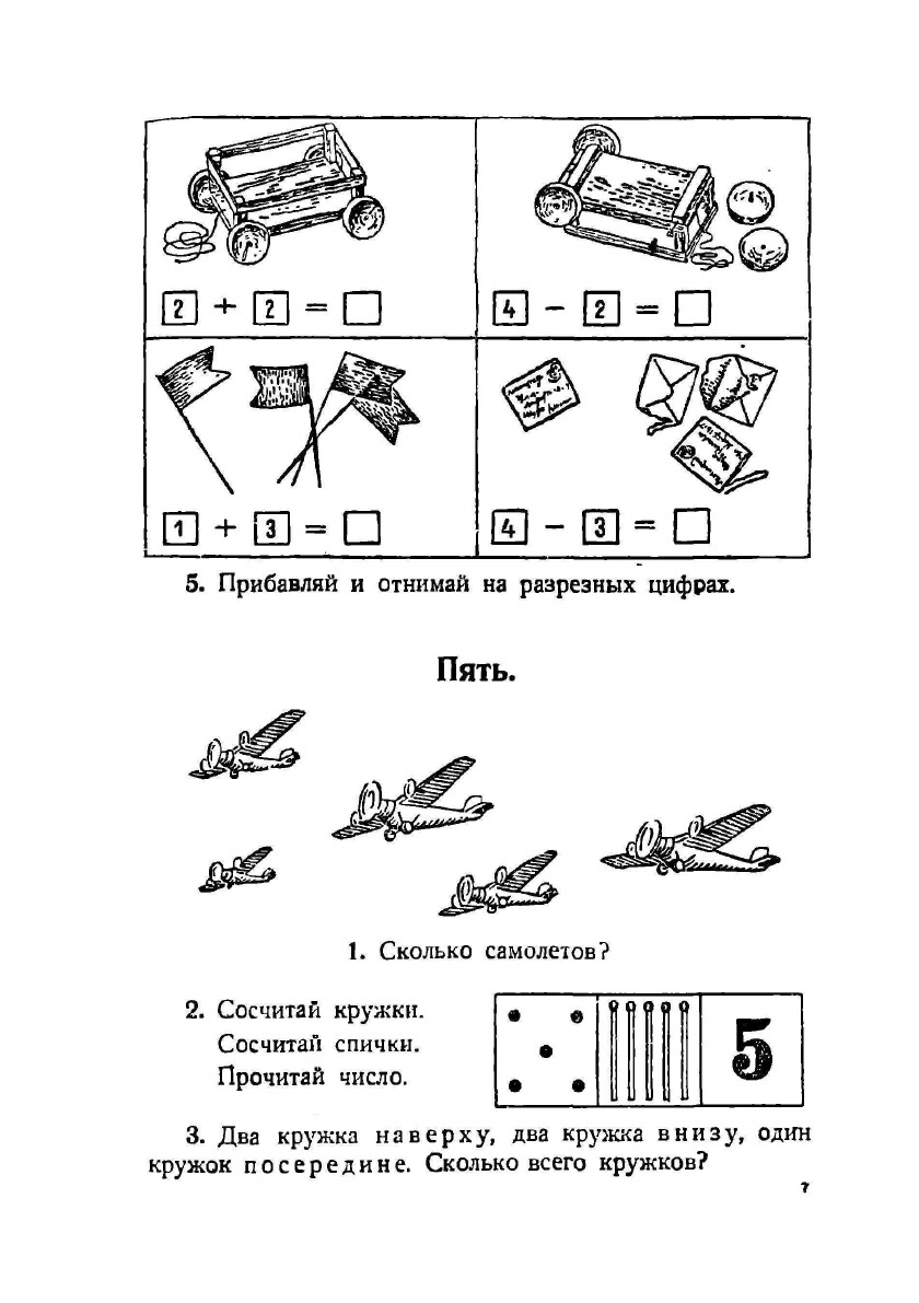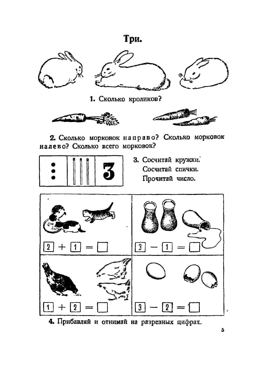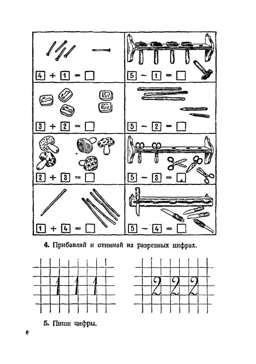 На первых порах, изучая состав чисел и счет до 10, дети учатся только узнавать цифры. В это время применяется разрезной дидактический материал. Письмо цифр начинается позднее и протекает медленнее. На первых порах в некоторых примерах встречаются цифры, которые дети еще не умеют писать. В таких случаях дается указание: «прибавляй и отнимай устно».