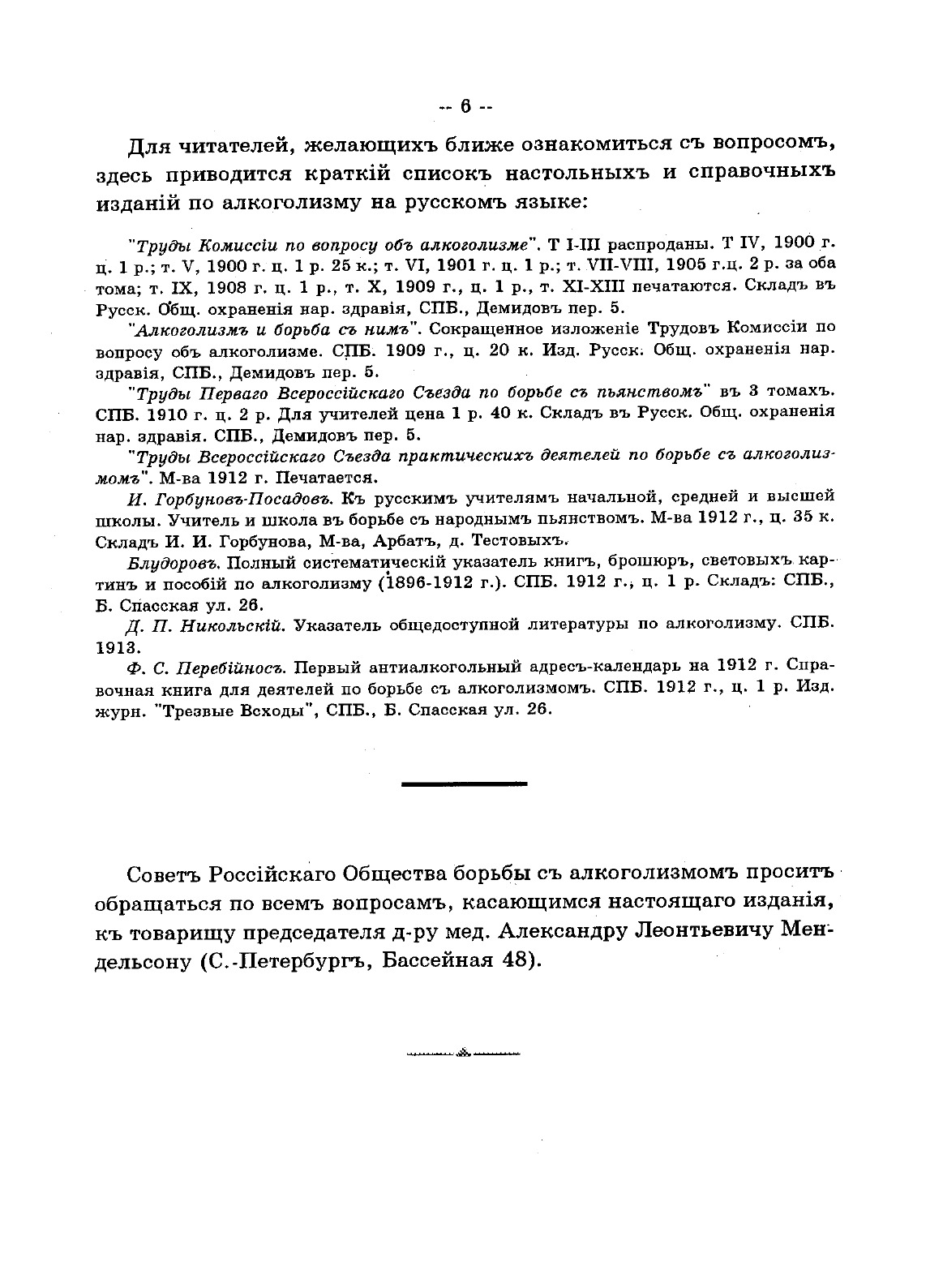 «Учебник трезвости» был составлен доктором медицины А.Л. Мендельсоном для начальной и средней школы по поручению Российского общества трезвости. «Учебник трезвости» создавался на основе уже существовавшего в то время пособия Жюля Дени, принятого в школах Швейцарии, но издание не является простым переводом. В соответствии с русскими реалиями был написан целый ряд глав; многие отделы подверглись значительным изменениям и дополнениям. В «Учебнике трезвости» собран материал для преподавания в школах, но он может служить и пособием для самообразования. Сегодня он вполне может быть использован для профилактических бесед с детьми и подростками. Издание содержит 4 части, в каждой из которых материал излагается поурочно.