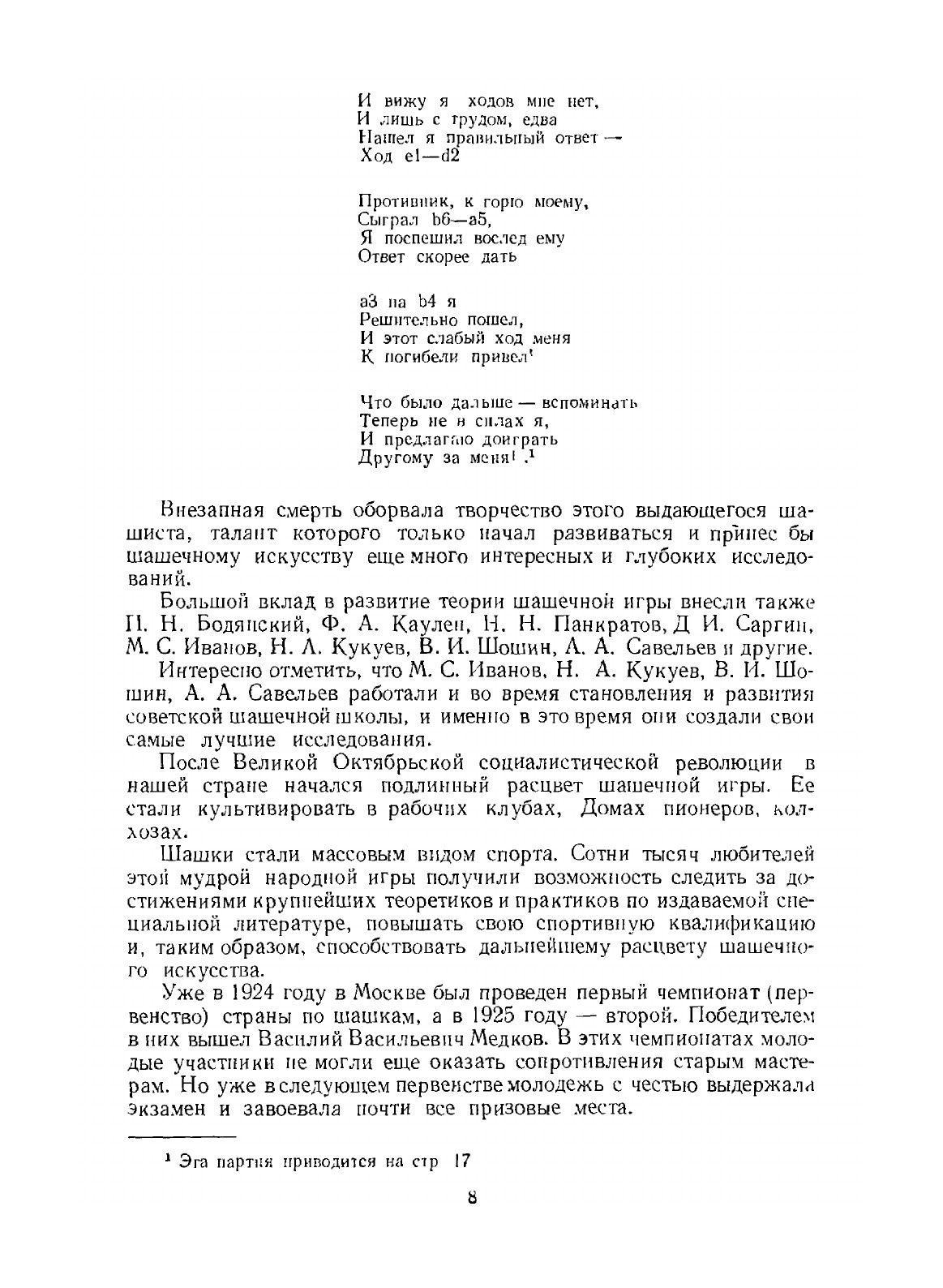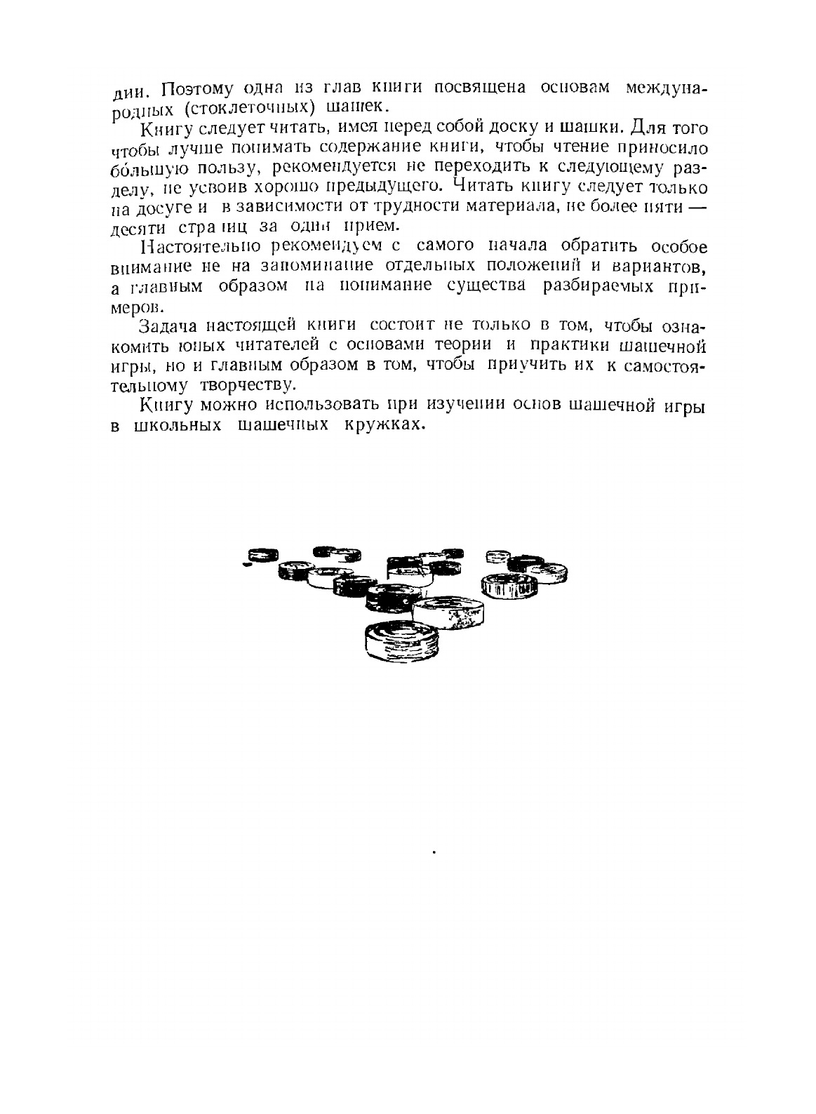Книга представляет из себя учебное пособие для тех, кто только заинтересовался шашками и тех, кто уже знаком первыми основами игры. Начиная от знакомства с шашечной доской и правилами и заканчивая вопросами организации турниров и выполнения спортивных нормативов, книга повествует о принципах игры, о стратегии и тактике шашечной борьбы, о том, как следует разыгрывать начала и окончания партий. Здесь читатель также найдет партии мастеров, данные в качестве примеров, отдельные интересные позиции и множество других материалов. Задача настоящей книги состоит не только в том, чтобы ознакомить юных читателей с основами теории и практики шашечной игры, но и главным образом в том, чтобы приучить их к самостоятельному творчеству.