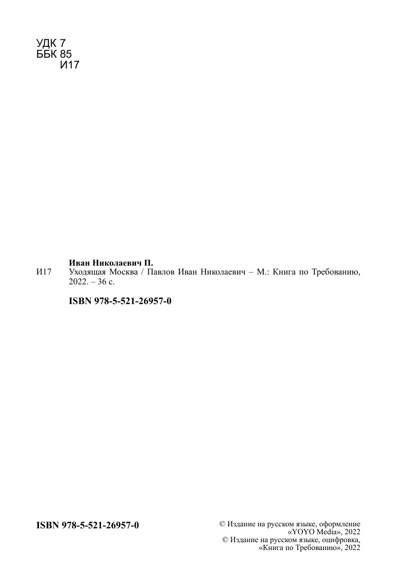 Печатная книга «Уходящая Москва» в мягкой обложке, язык - русский. В книге 36 страниц, она напечатана на белой офсетной бумаге плотностью 80 г/м². Формат издания — 148x210 мм. Все книги аккуратно упаковываем в прочный трёхслойный непрозрачный картонный конверт.