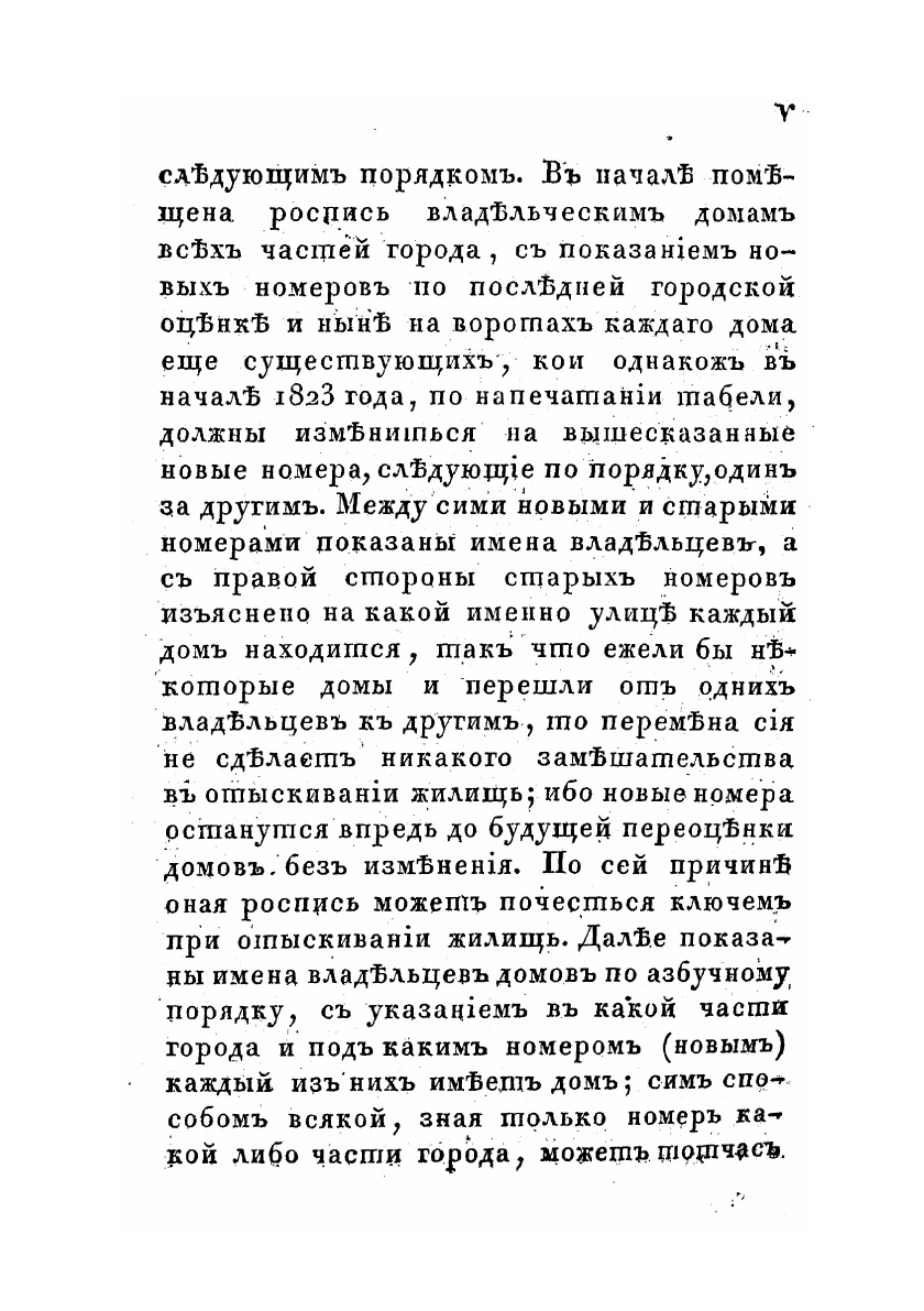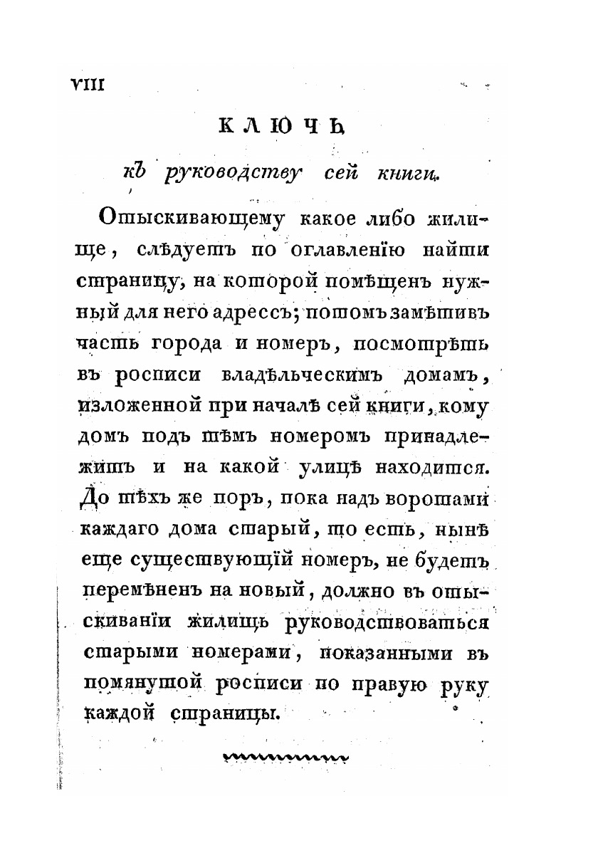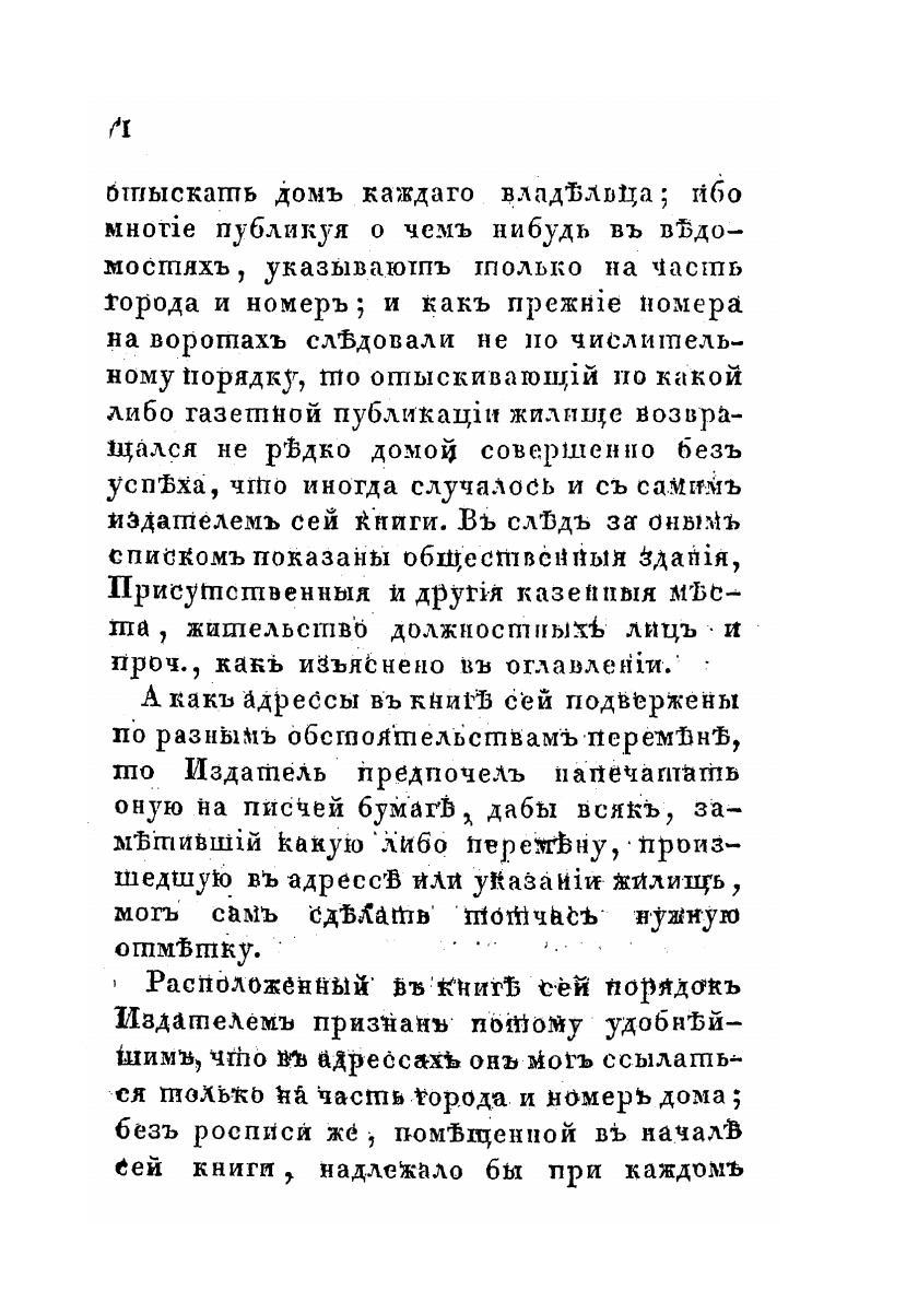 Жители сей обширной Столицы, а в особенности приезжающие сюда, имели часто затруднение в отыскивании жилищ по С. Петербургу. Таковое неудобство, сопряженное с потерей времени и бесполезными издержками, побудило Издателя помыслить о составлении книги, которая бы в упомянутых случаях отвратила всякое затруднение и могла бы служить каждому верным и скорым указателем.