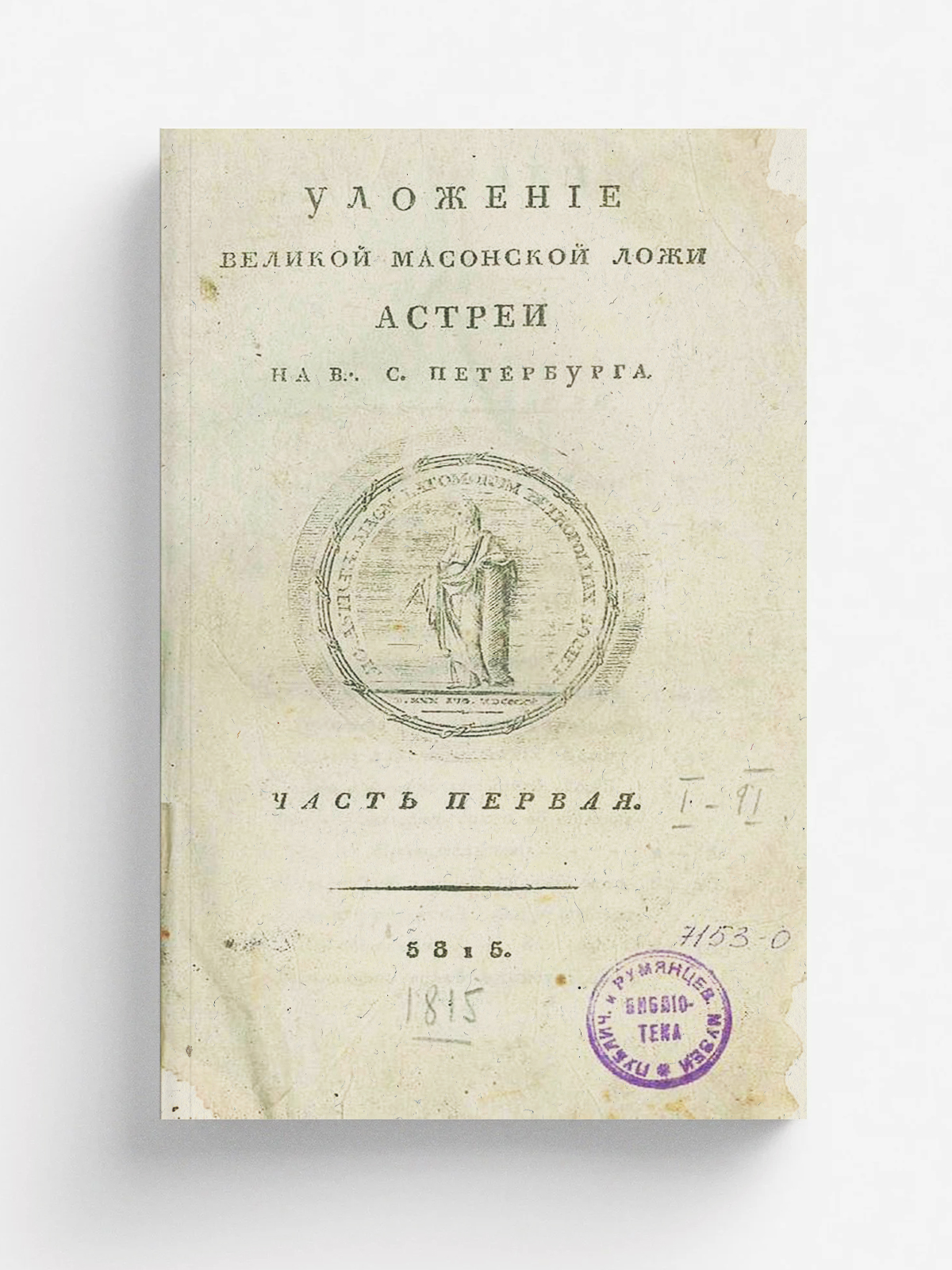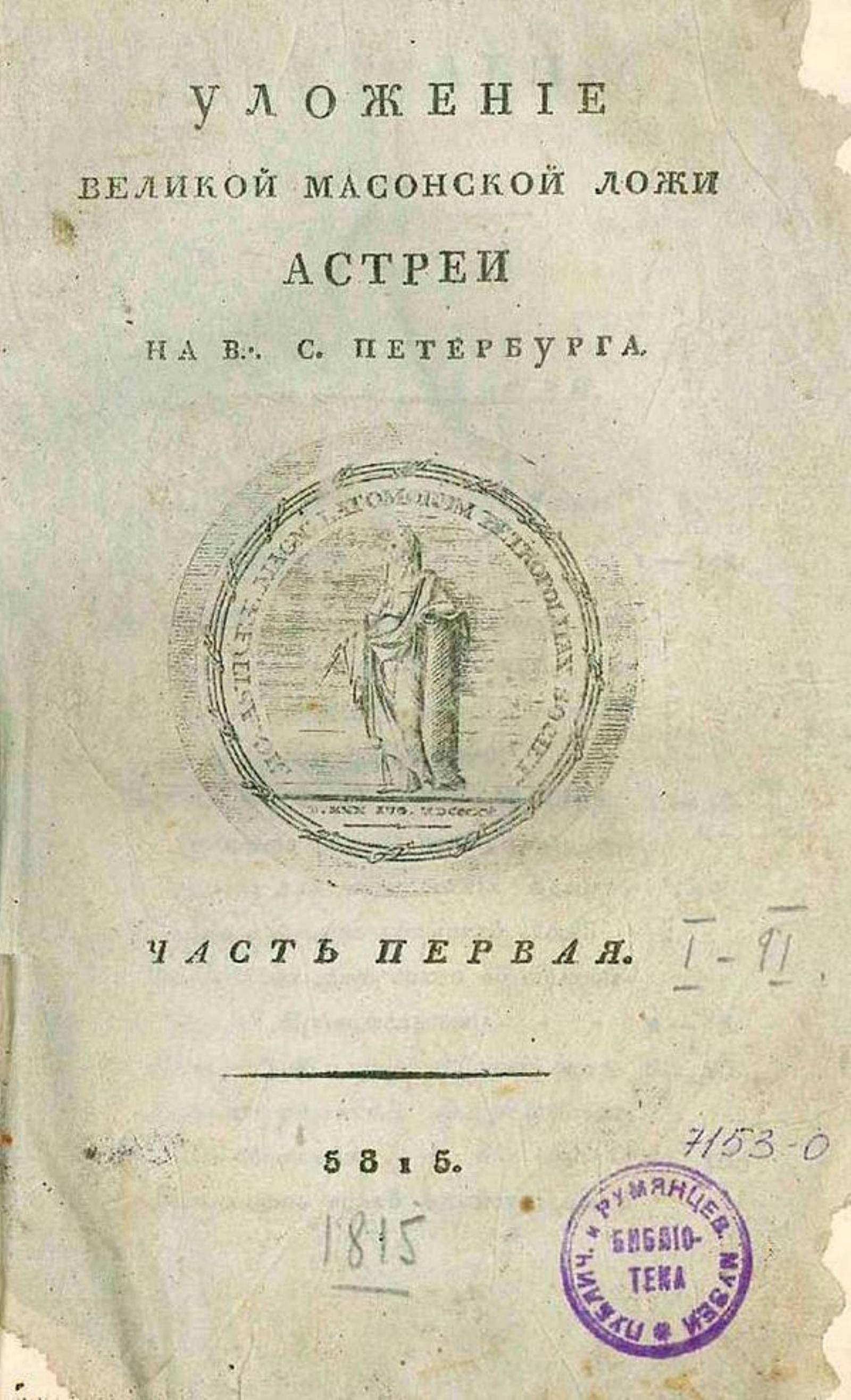 «Астрея» (масонская ложа; Петербург). Уложение великой масонской ложи Астреи на В...С.Петербурга. 5815. — [Спб., Не ранее 1818]. — 8° (21 см).