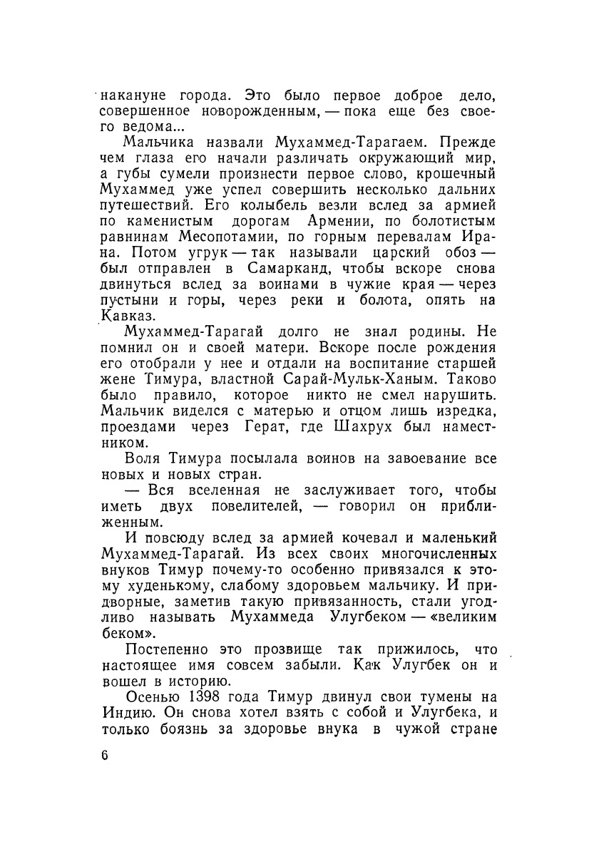 ...это не роман, а биография, созданная на твердой почве строгих, неоспоримых фактов. Перед вами жизнь человека, которого звали Улугбек. Настоящее имя его было иным, но его забыли. А Улугбека будут помнить и через тысячи лет. Он был царем, внуком Тимура; любил охоту, стихи, музыку, веселье пирушек. Но он стал великим ученым и размышлял о загадочных судьбах звезд до той последней минуты, когда голову его срубила сабля убийцы. Сабля оказалась очень острой: еще и сейчас, спустя пять веков, ее след заметен на его черепе... Открытия Улугбека далеко опередили свою эпоху и живут в науке до сих пор. Они помогли человечеству проложить дорогу к звездам.