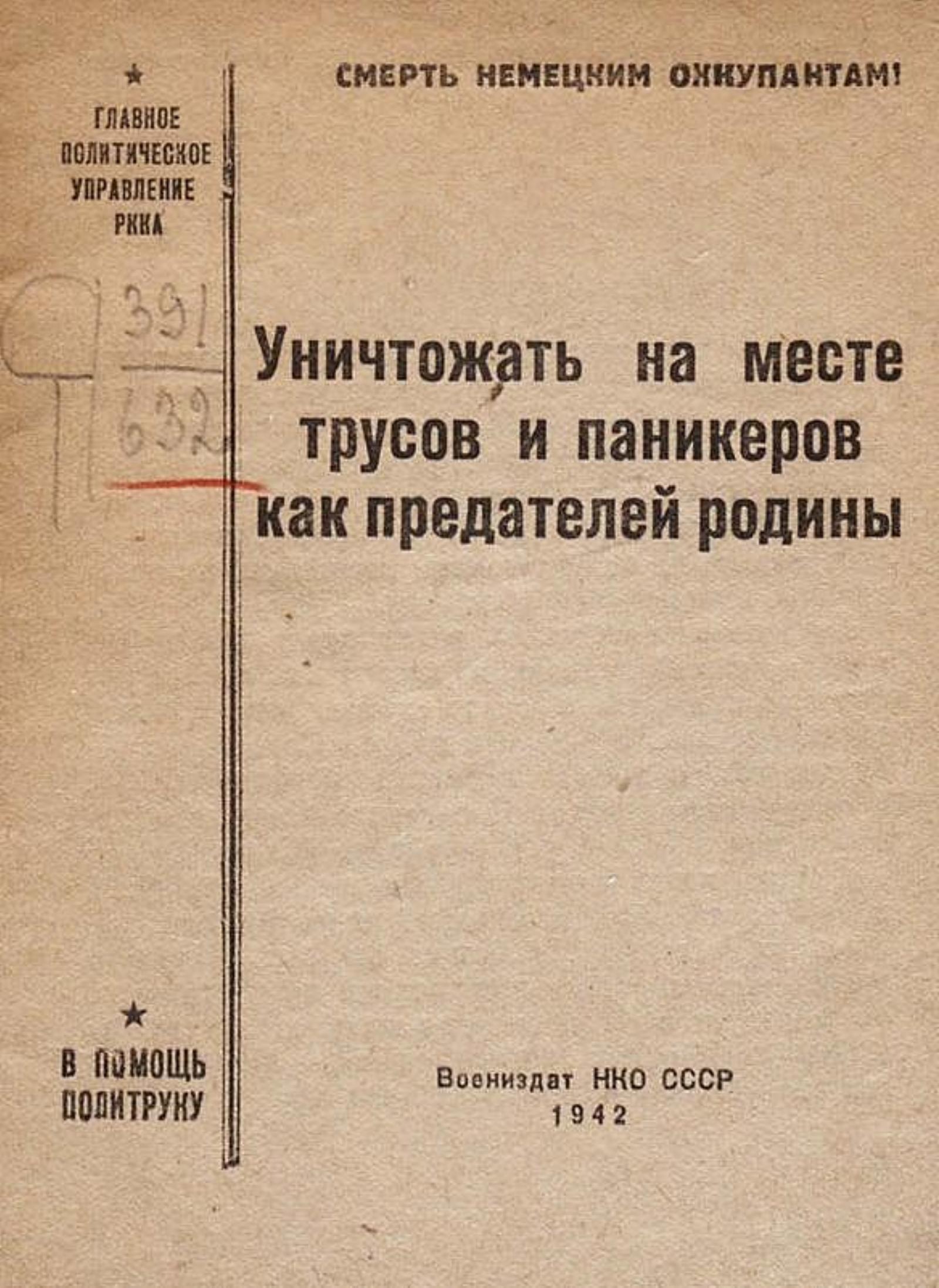 Уничтожать на месте трусов и паникеров как предателей Родины / Гл. полит. упр. РККА. — [Москва] : Воениздат, 1942. — 20 с., без обл.; 14 см. — (В помощь политруку).