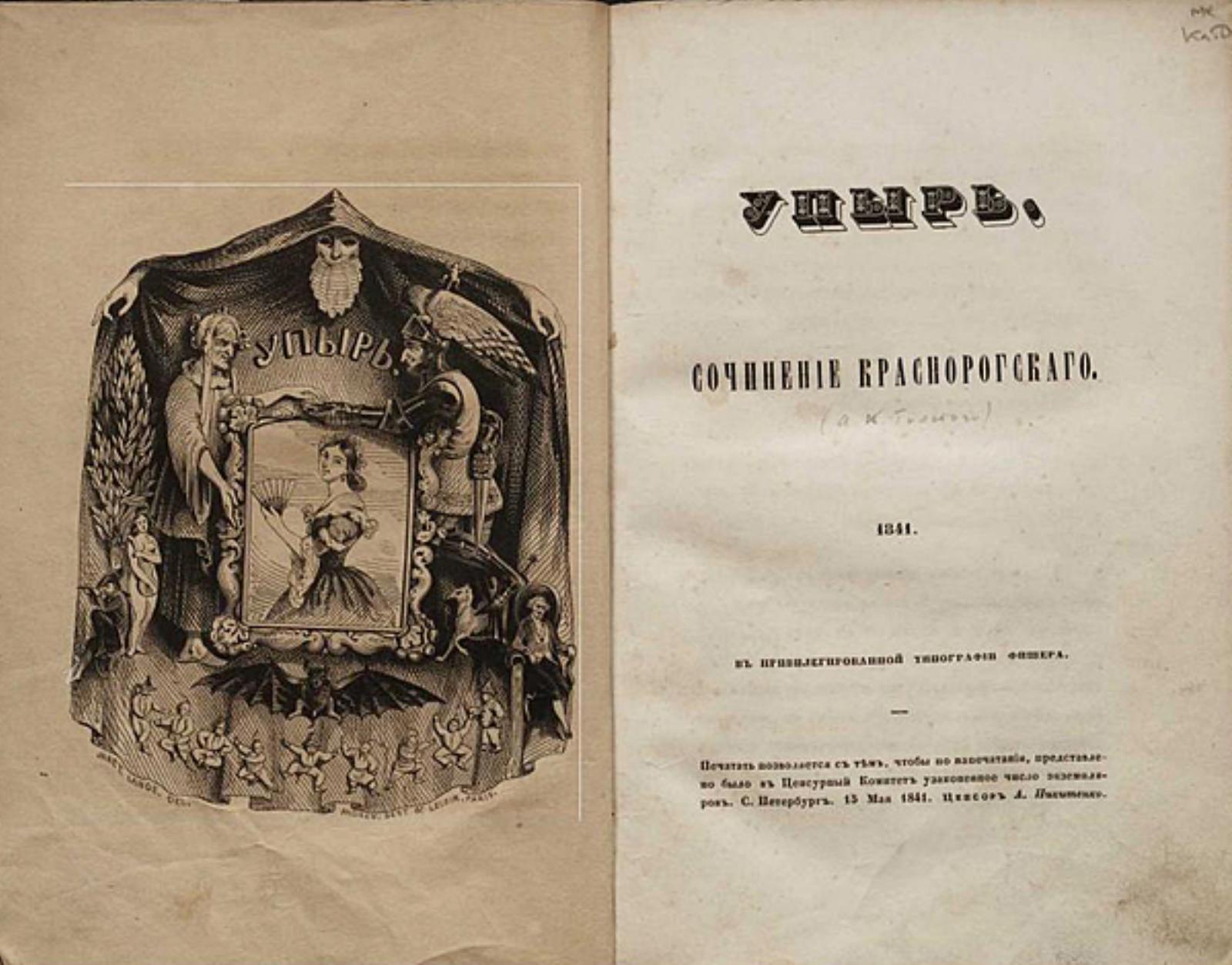 Толстой, Алексей Константинович (1817–1875). Упырь / Соч. Краснорогского [псевд.]. — [Санкт-Петербург] : тип. Фишера, 1841. — [2], 177 с., 1 л. ил.; 20 см.