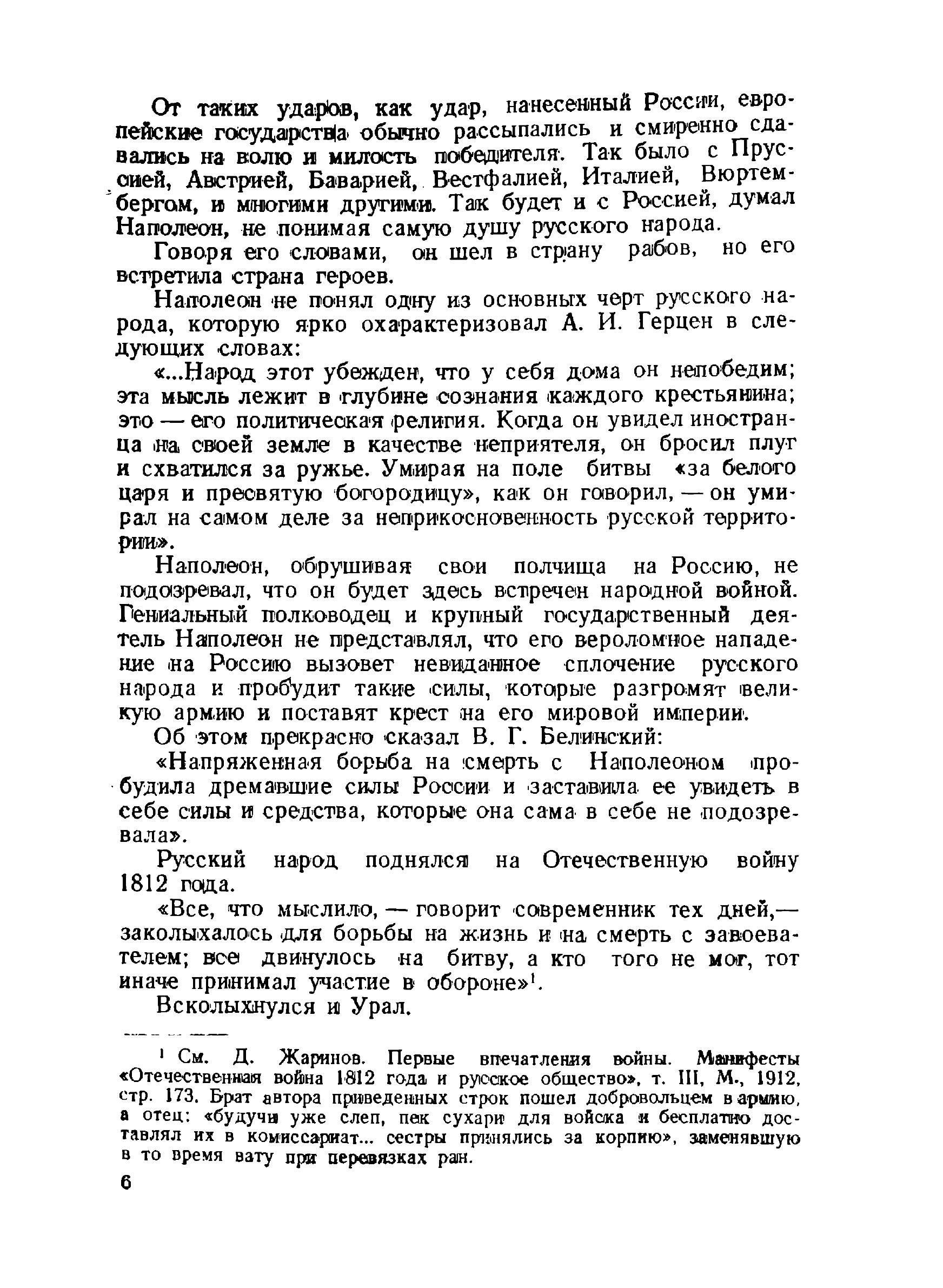 В предлагаемом вниманию читателя сборнике собраны документы, освещающие то, что было выполнено русскими людьми на Урале во время Отечественной войны 1812 года. Сборник состоит из статьи проф. В. В. Данилевского и документов, хранящихся в Свердловском, Молотовском, Нижне-Тагильском, Ирбитском государственных архивах. Единственное исключение представляет указ Александра I от 13/25/июня 1812 г. о вторжении Наполеона и необходимости отразить силу силою. Этот документ взят из Полного собрания законов Российской империи. Все остальные документы представляют достояние уральских архивов.
