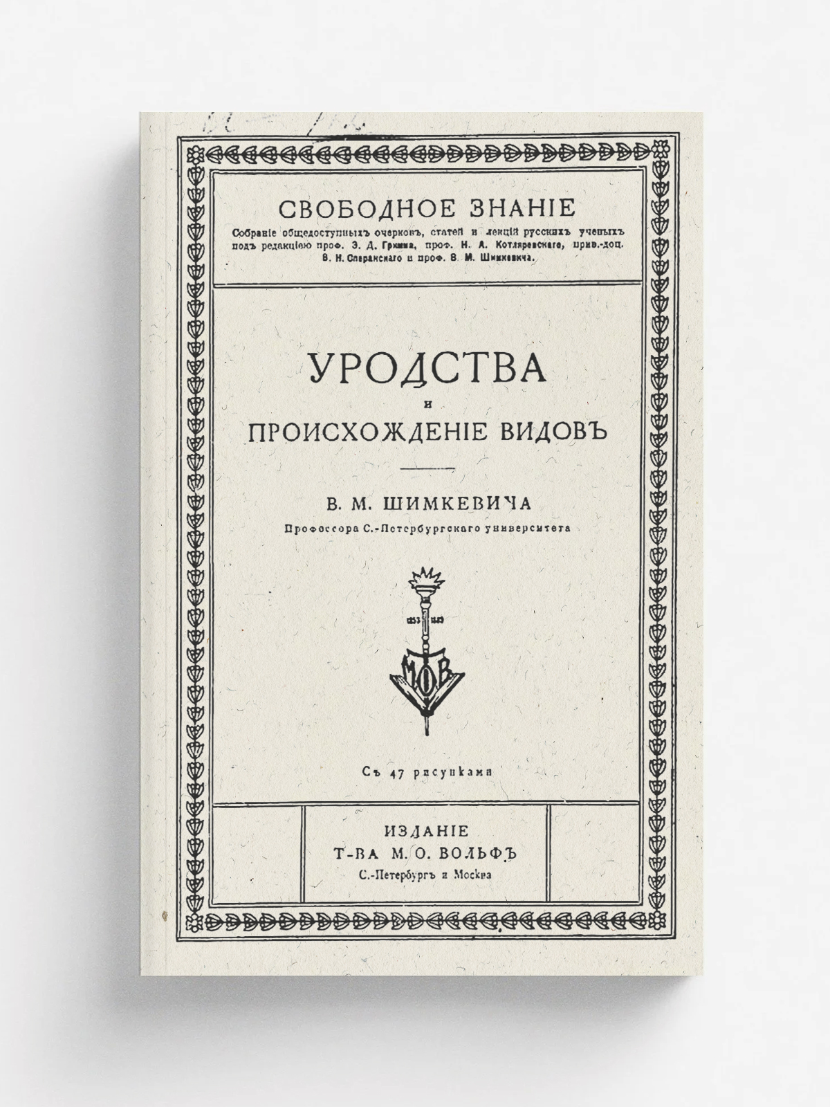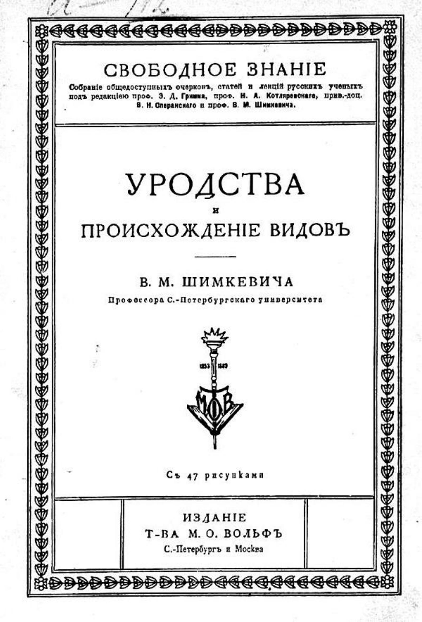 Шимкевич, Владимир Михайлович (1858–1923). Уродства и происхождение видов / [Соч.] В. М. Шимкевича, проф. С.-Петерб. ун-та. — Санкт-Петербург ; Москва : т-во М. О. Вольф, [1909] (Санкт-Петербург). — [4], 106, [1] с., 47 ил.; 23.