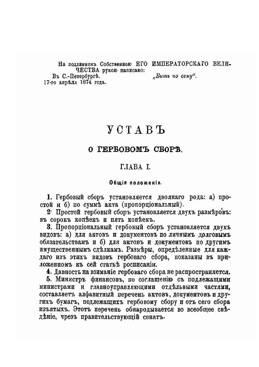 Устав о новом гербовом сборе... утвержденный 17 апреля 1874 г. : Руководство для лиц всех сословий и званий. : С прил. всех дополнительных узаконений, алфавитного (азбучного) перечня документов и актов, подлежащих гербовому сбору и от него изъятых; расписания разборов новой гербовой бумаги; табели сравнит. ценности иностр. денег для определения гербовой пошлины с актов, писанных на сии деньги и табели определяющей законную оценку земель в различных губерниях. Издание А. Дмитриева.