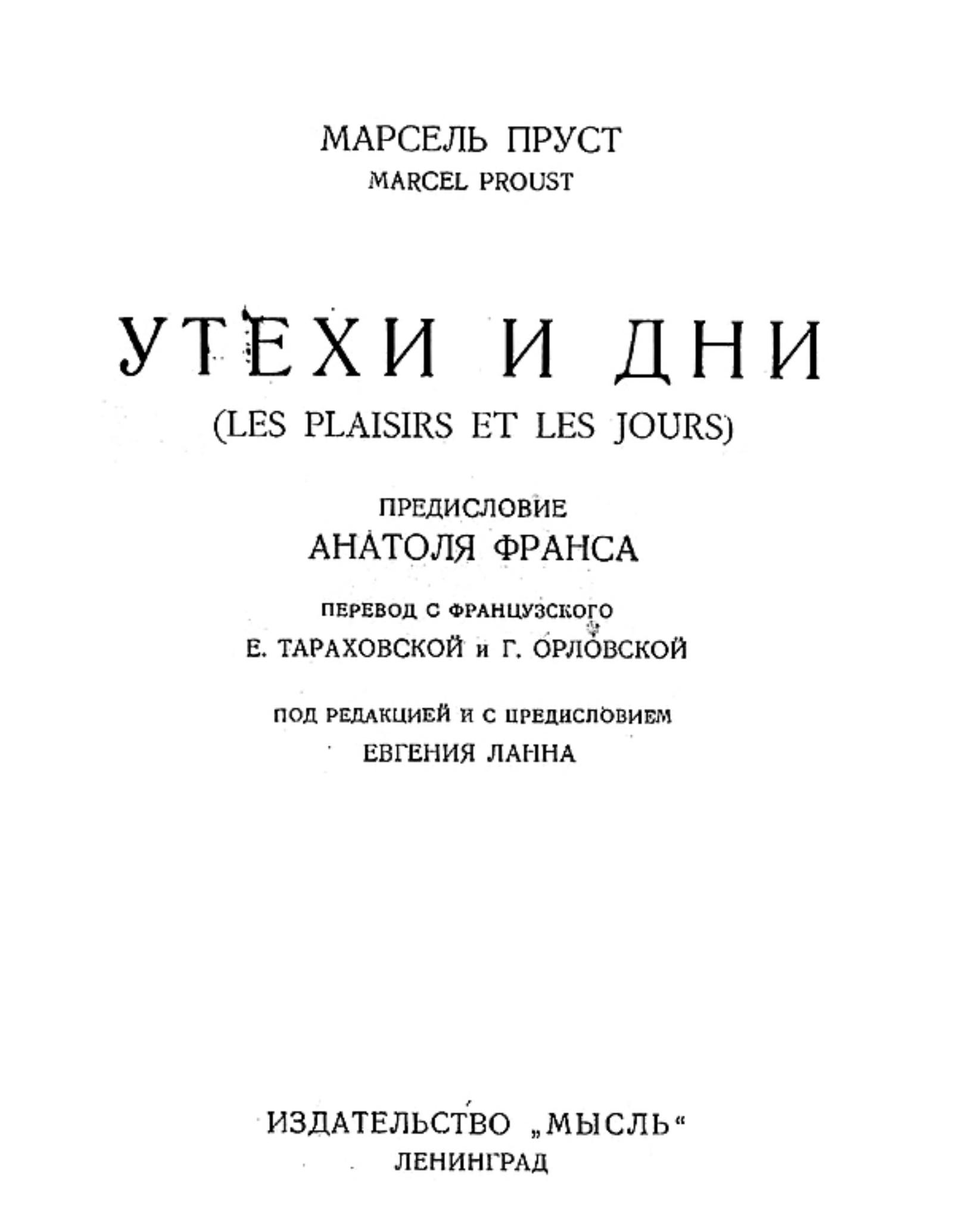 Пруст, Марсель (1871–1922). Утехи и дни / Марсель Пруст ; Предисл. Анатоля Франса ; Пер. с франц. Е. Тараховской и Г. Орловской ; Под ред. и с предисл. Евгения Ланна. — Ленинград : «Мысль», [1927]. — 176 с.; 17 см.