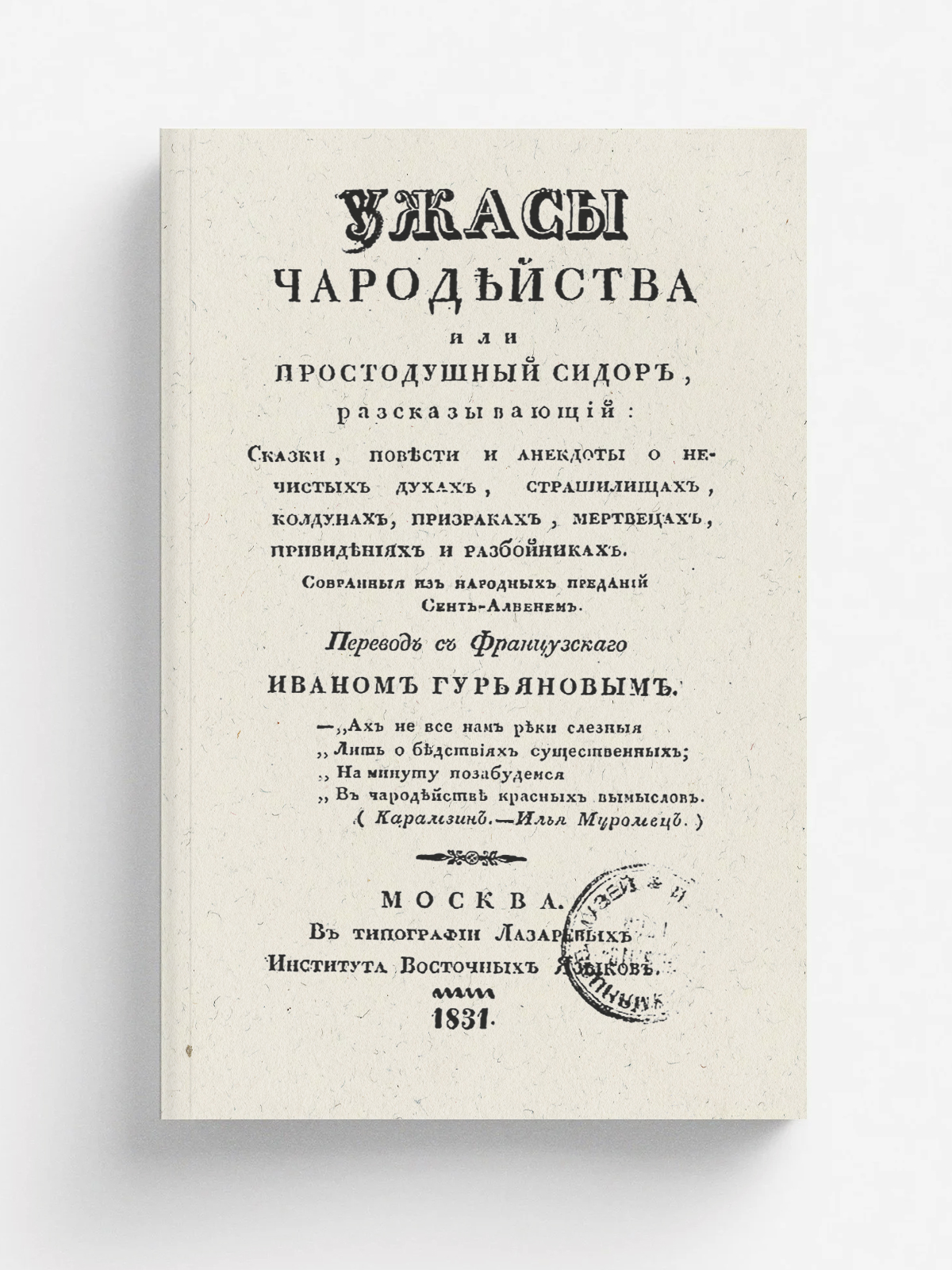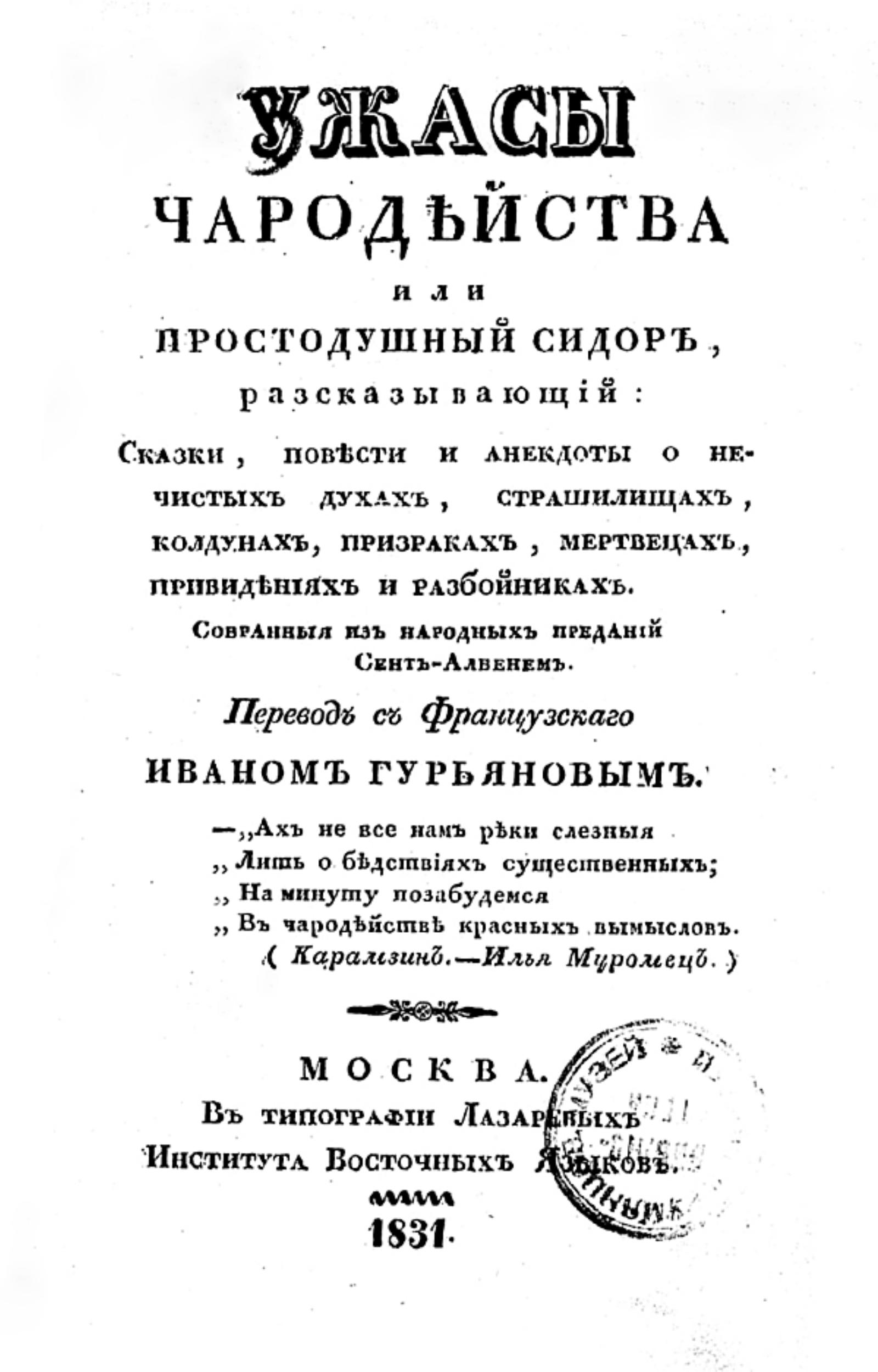 Коллен де-Планси, Жак Альбен Симон (1793–1881). Ужасы чародейства, или Простодушный Сидор, рассказывающий: сказки, повести и анекдоты о нечистых духах, страшилищах, колдунах, призраках, мертвецах, привидениях и разбойниках, собранные из народных преданий Сент-Албенем [псевд.] / Пер. с фр., [сделанный] Иваном Гурьяновым. — Москва : тип. Лазаревых Ин-та вост. языков, 1831. — [4], 167 с.; 18.
