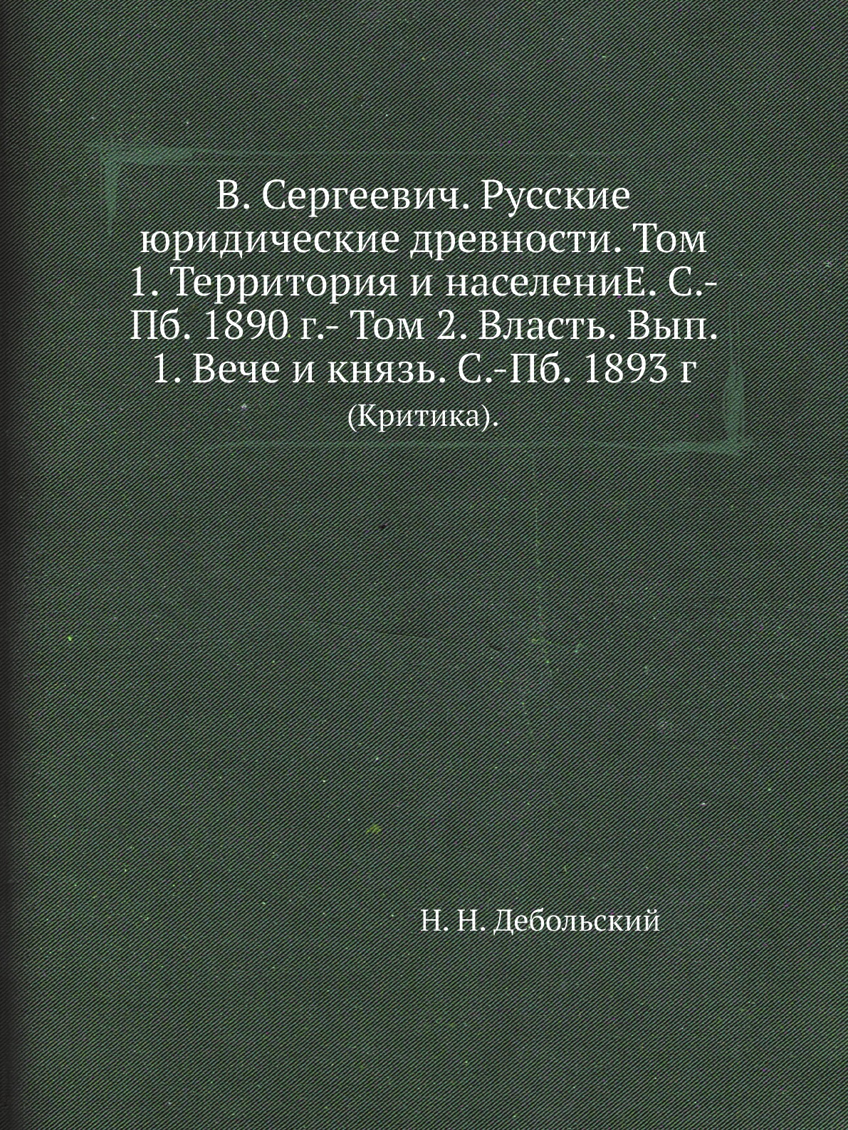 Печатная книга «В. Сергеевич. Русские юридические древности. Том 1. Территория и населениЕ. С.-Пб. 1890 г.- Том 2. Власть. Вып. 1. Вече и князь. С.-Пб. 1893 г., (Критика).» в мягкой обложке, язык - русский. В книге 89 страниц, она напечатана на белой офсетной бумаге плотностью 80 г/м². Формат издания — 205x280 мм. Все книги аккуратно упаковываем в прочный трёхслойный непрозрачный картонный конверт.