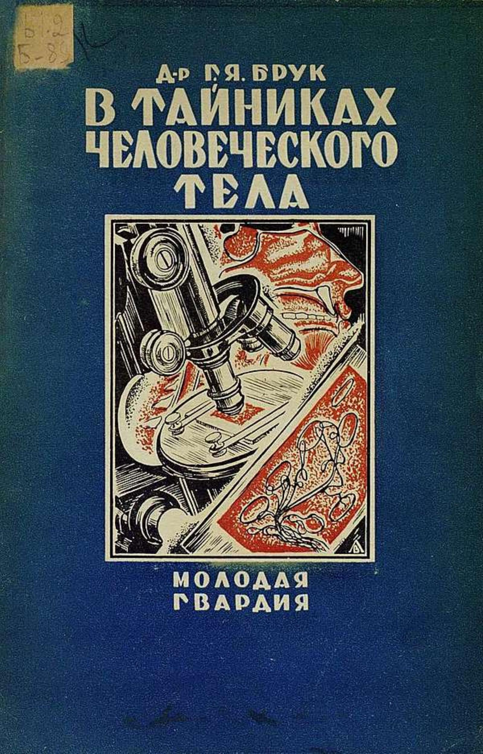 Брук, Григорий Яковлевич. В тайниках человеческого тела. : С илл. / Д-р Г. Я. Брук ; Под ред. проф. Н. С. Понятского ; Обложка: Л. В. ; Предисловие: проф. Н. Понятский. — Москва ; Ленинград : Молодая гвардия, 1927 (М. : 5-я тип. «Транспечати» НКПС «Пролетарское слово»). — 87 с. : ил., черт., схем.; 27?18 см. — (Для детей старшего возраста).