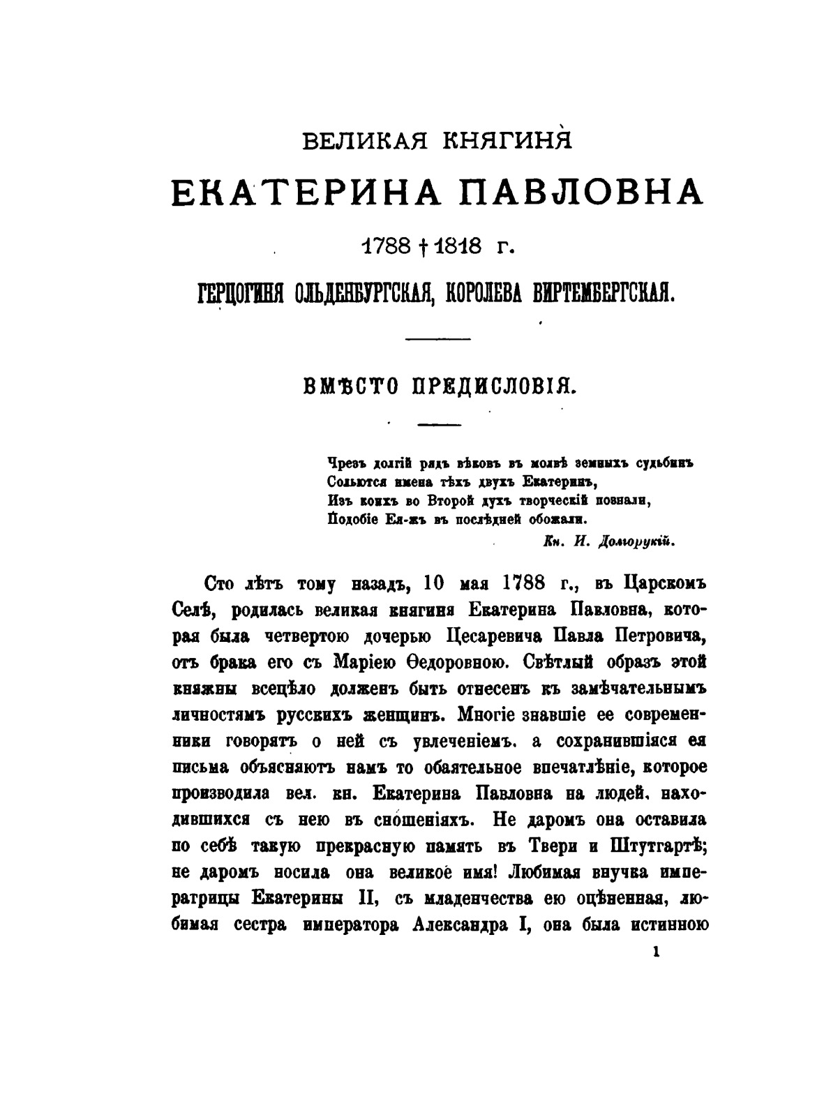 Великая княгиня Екатерина Павловна, четвертая дочь императора Павла I, Герцогиня Ольденбургская, королева Виртембергская. 1788-1818. Биографический очерк с приложением портрета и автографа.