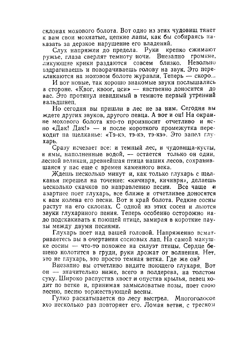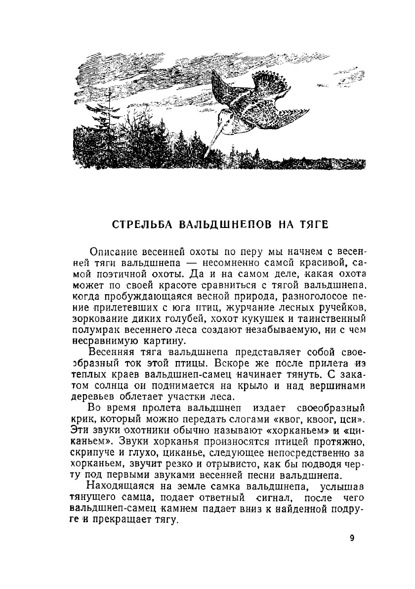 Как электрическая искра, облетела охотников радостная, волнующая весть — «тянут»! Это короткое как будто ничего не говорящее слово для охотников — долгожданный сигнал. Тянут вальдшнепы, — это значит пришла пора весенней охоты. Пора, которую так долго ожидали охотники-спортсмены, о которой так часто мечтали они в студеные зимние вечера, когда за окном шумели вьюги и тяжелыми хлопьями падал снег.