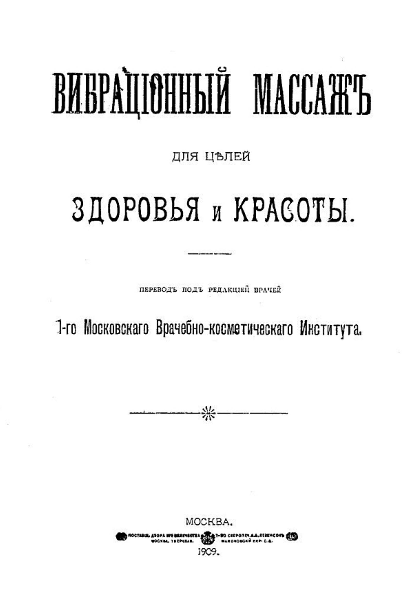 Вибрационный массаж для целей здоровья и красоты / Пер. под ред. врачей 1 Моск. врачеб.–космет. ин–та. — Москва : А. Ралле и К°, 1909. — 47 с., 18 л. ил.; 22.
