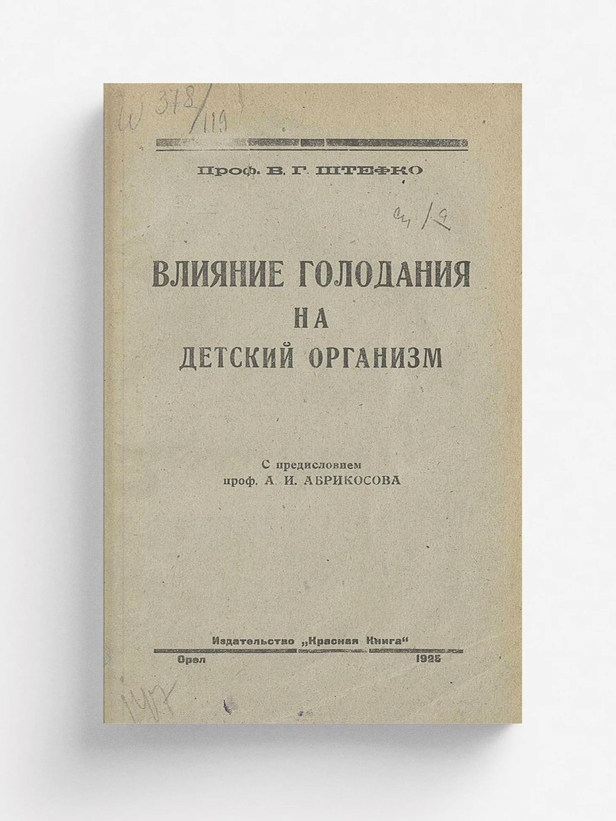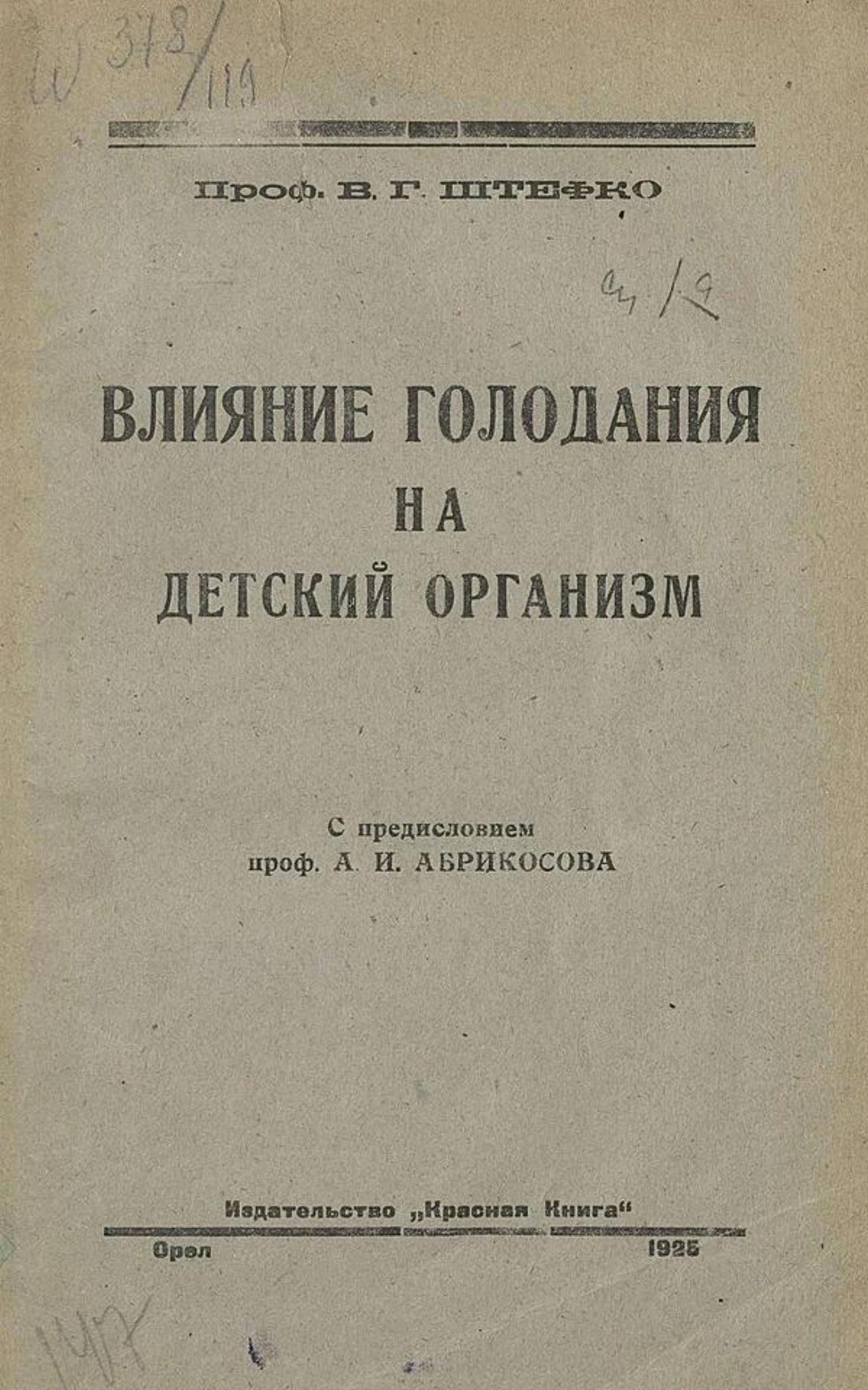 Штефко, Владимир Германович. Влияние голодания на детский организм : С добавлениями: 1. Краткого очерка современного состояния учения о витаминах и 2. Таблицы содержания витаминов в различных пищевых продуктах / Проф. В. Г. Штефко ; Предисл. проф. А. И. Абрикосова. — Орел : Красная книга, 1924. — 163, II с. : ил.; 26 см.