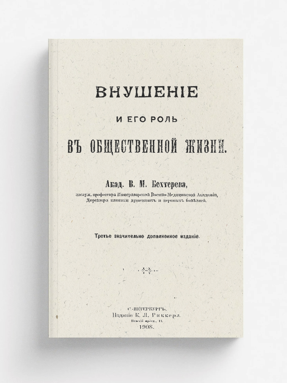 Бехтерев, Владимир Михайлович (1857–1927). Внушение и его роль в общественной жизни / [Соч.] В. М. Бехтерева, проф. Имп. Воен.-мед. акад., дир. Клиники душев. и нерв. болезней. — 3-е изд., знач. доп. — Санкт-Петербург : К. Л. Риккер, 1908. — [8], 175 с.; 22.