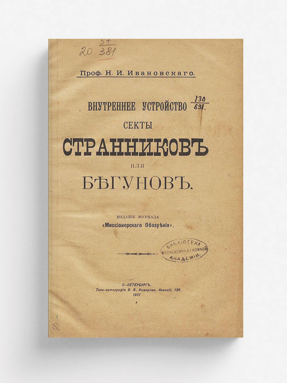 Ивановский, Николай Иванович (1840–1913). Внутреннее устройство секты странников или бегунов / [соч.] проф. Н. И. Ивановского. — Санкт-Петербург : журн. «Миссионерское обозрение», 1901. — 102 с.; 22 см.