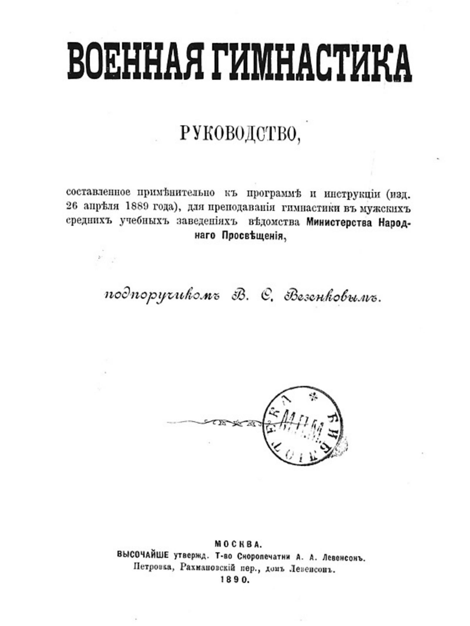 Военная гимнастика: Руководство, сост. применительно к прогр. и инструкции (изд. 26 апр. 1889 г.), для преподавания гимнастики в муж. сред. учеб. заведениях ведомства М-ва нар. прос., подпоручиком В. С. Везенковым. — Москва: т-во скоропеч. А. А. Левенсон, 1890. — [2], VII, [3], 218 с., 19 л. ил.; 21.