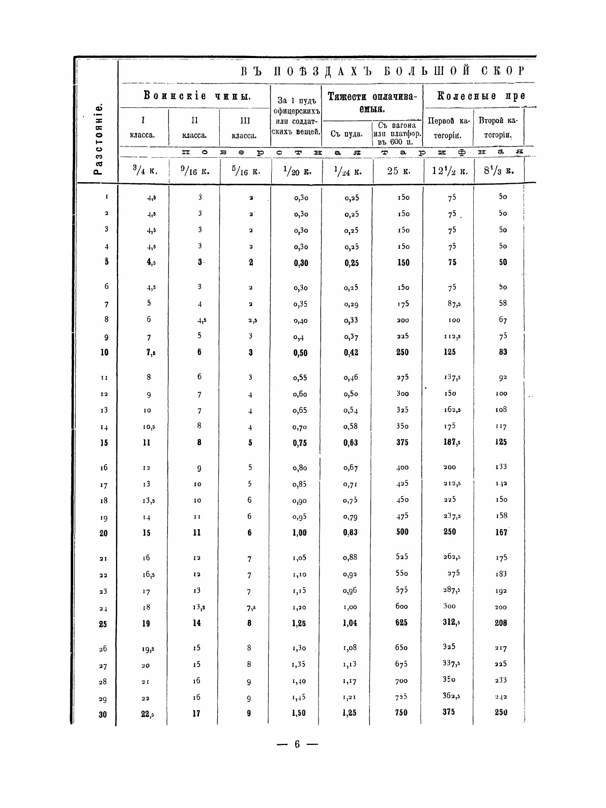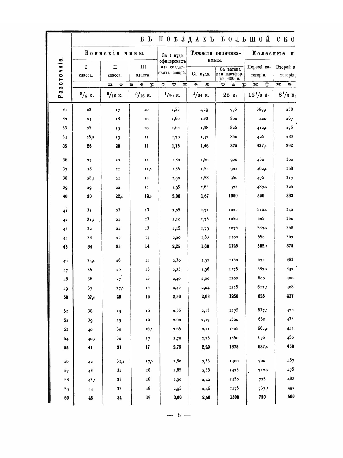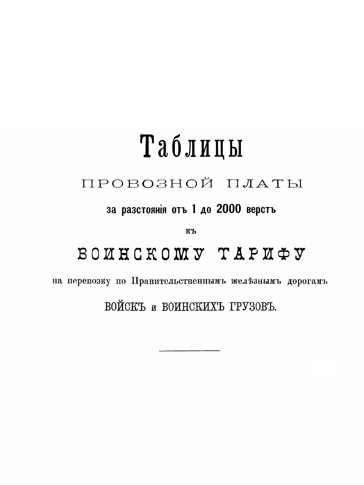 Воинский тариф на перевозку по правительственным железным дорогам войск и воинских грузов. Министерство путей сообщения Временного Управления казенных железных дорог. Расчетные таблицы от 1 до 2000 верст и таблицы тарифных поверстных расстояний казенных железных дорог.