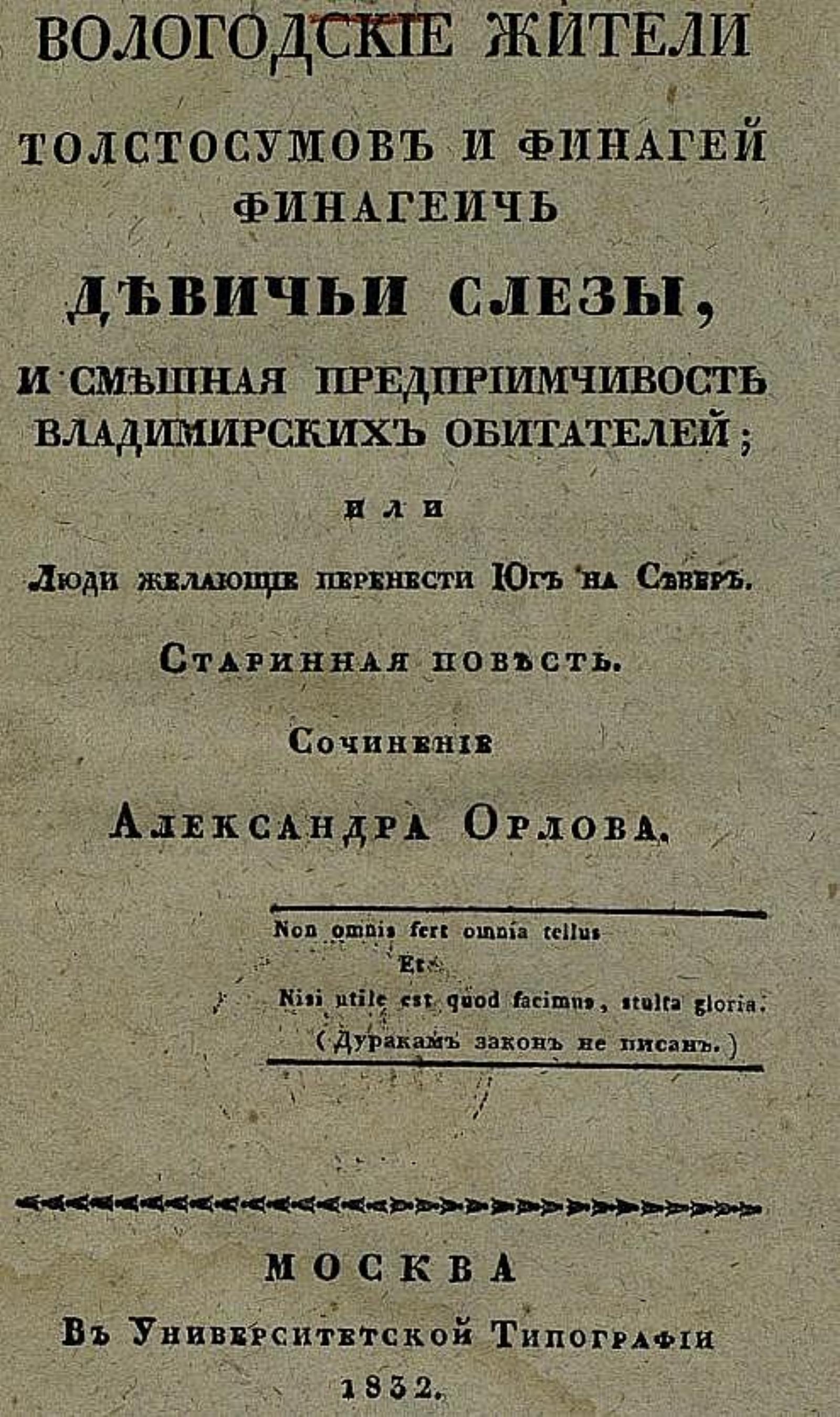 Орлов, Александр Анфимович (1790?–1840). Вологодские жители Толстосумов и Финагей Финагеич Девичьи слезы, и смешная предприимчивость владимирских обитателей, или Люди желающие перенести юг на север : Старин. повесть / Соч. Александра Орлова. — Москва : Унив. тип., 1832. — 36 с.; 18.