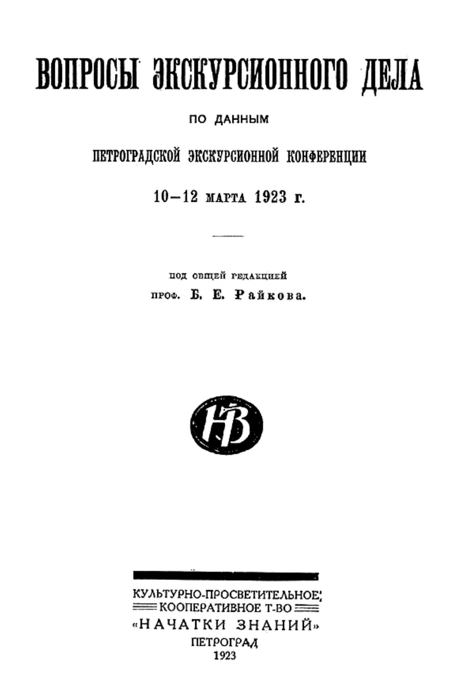 Вопросы экскурсионного дела : по данным Петроградской экскурсионной конференции, 10-12 марта 1923 г. / под общ. ред. Б. Е. Райкова. — Петроград : Начатки знаний, 1923. — 138, [1] с.; 22 см.
