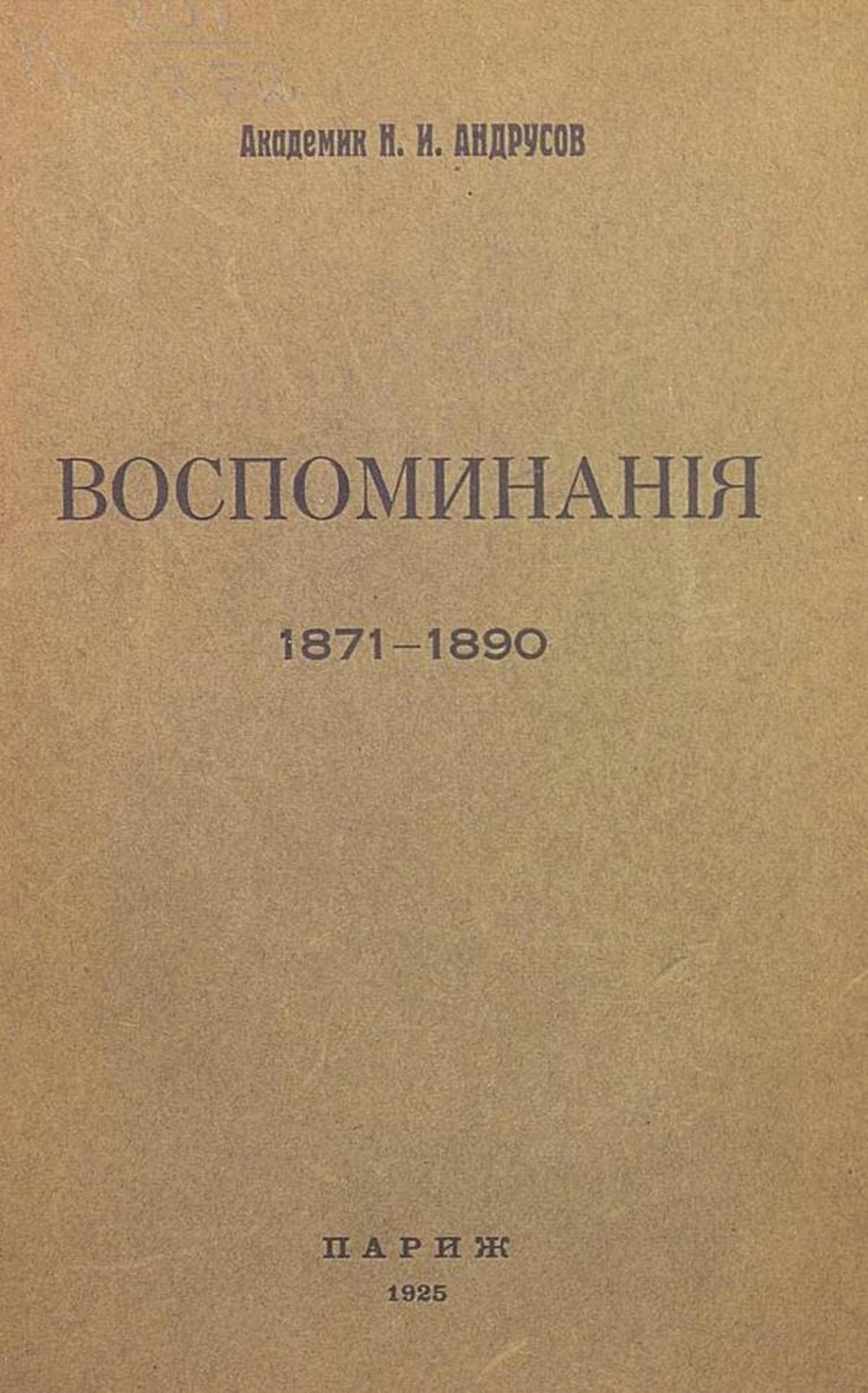 Андрусов, Николай Иванович (1861–1924). Воспоминания, 1871–1890 / Акад. Н. И. Андрусов. — [Париж : б.и., 1925] (Paris : Impr. d'Art Voltaire). — 198 с. : 1 л. портр.; 20 см.