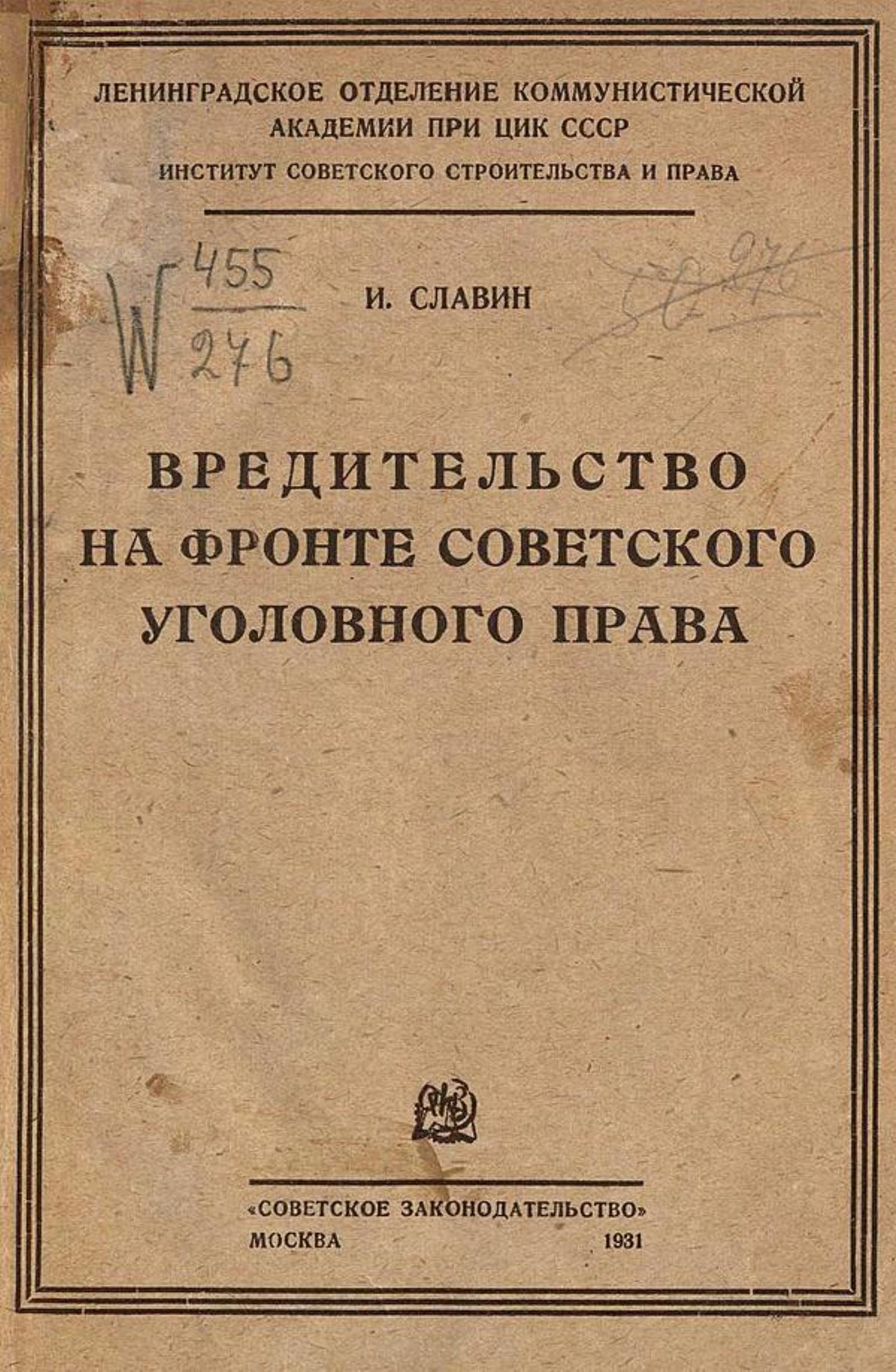 Славин, И. Вредительство на фронте советского уголовного права / И. Славин ; Ленингр. отд-ние Ком. акад. при ЦИК СССР. Ин-т сов. строительства и права. — Москва : Советское законодательство, 1931 (тип. «Советское законодательство»). — 111 с.; 22?15 см.