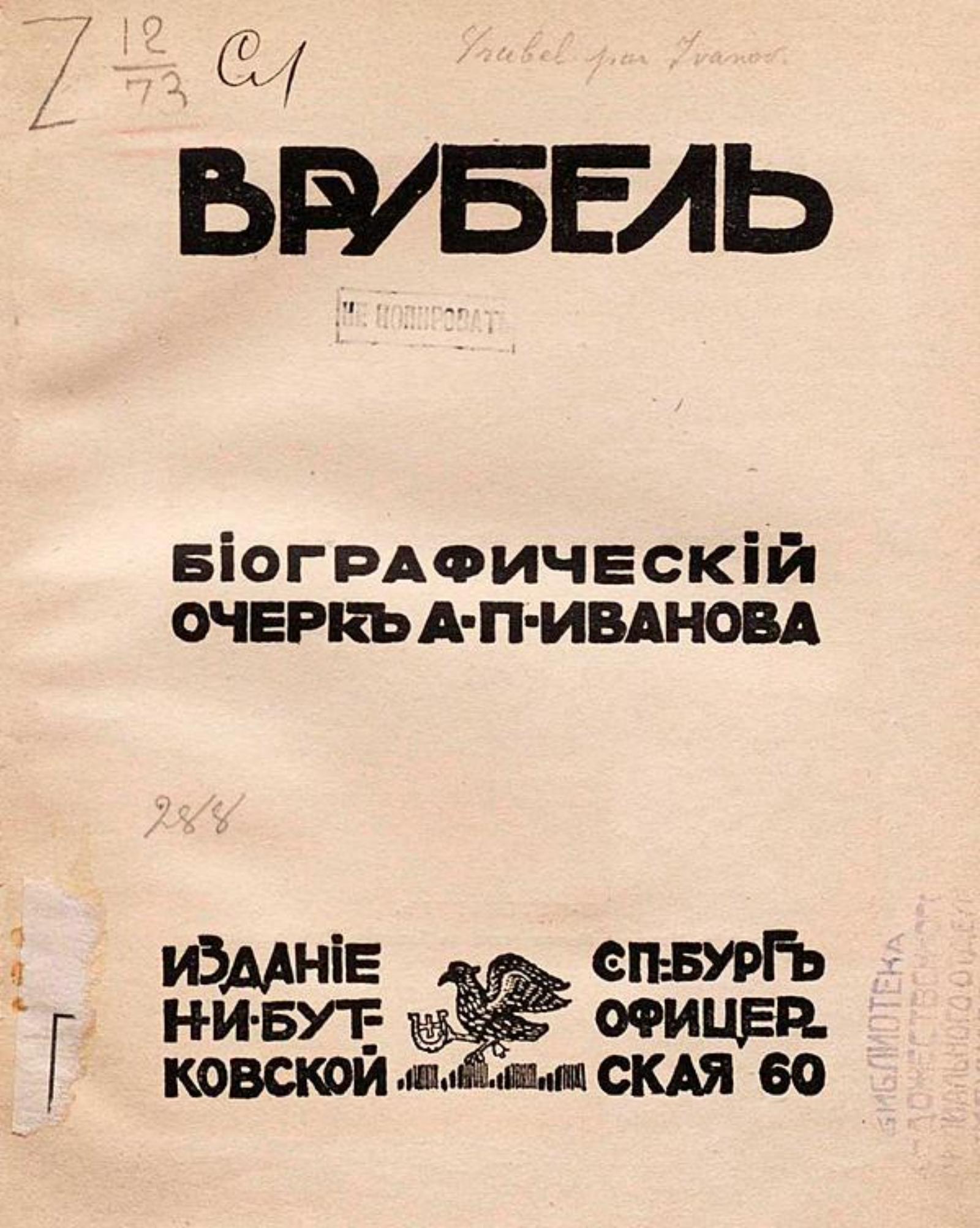 Иванов, Александр Павлович (1876–1933). Врубель : Биогр. очерк А. П. Иванова. — Санкт-Петербург : Н. И. Бутковская, 1911. — [4], 84, IX с., 1 л. фронт. (портр.), [23] л. цв. ил.; 20. — (Современное искусство. Серия иллюстрированных монографий; Вып. 2).