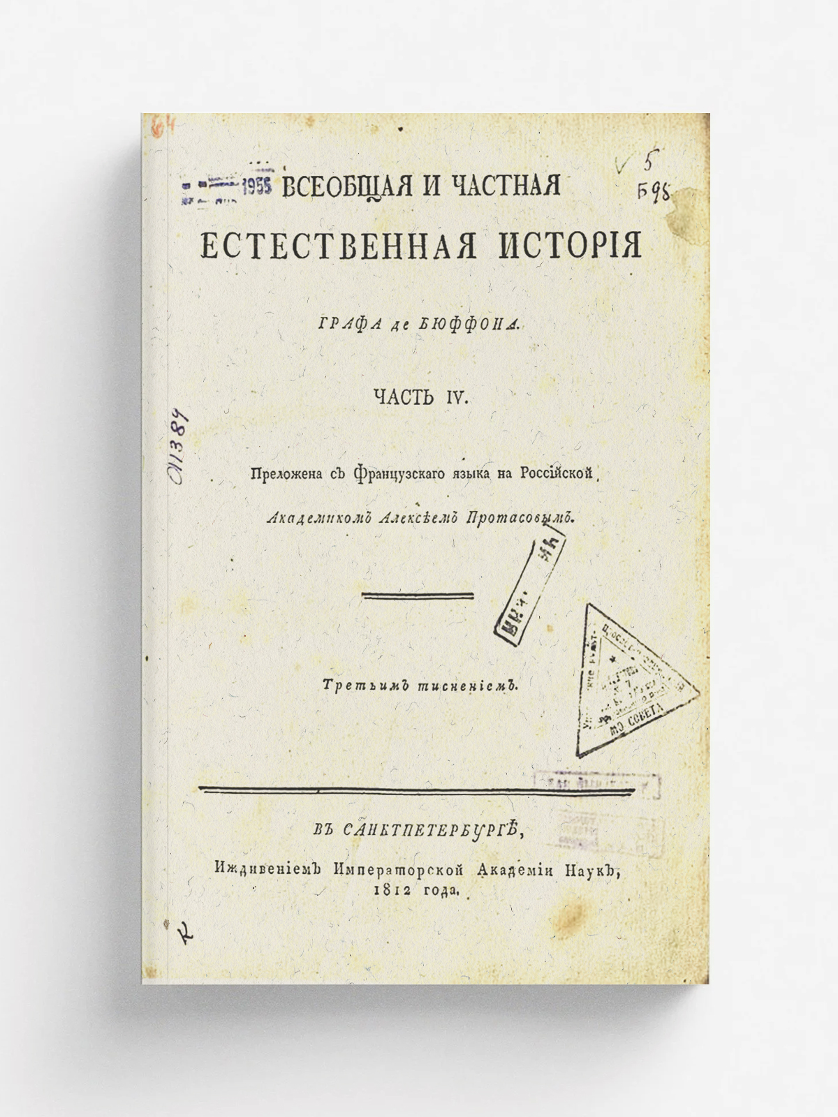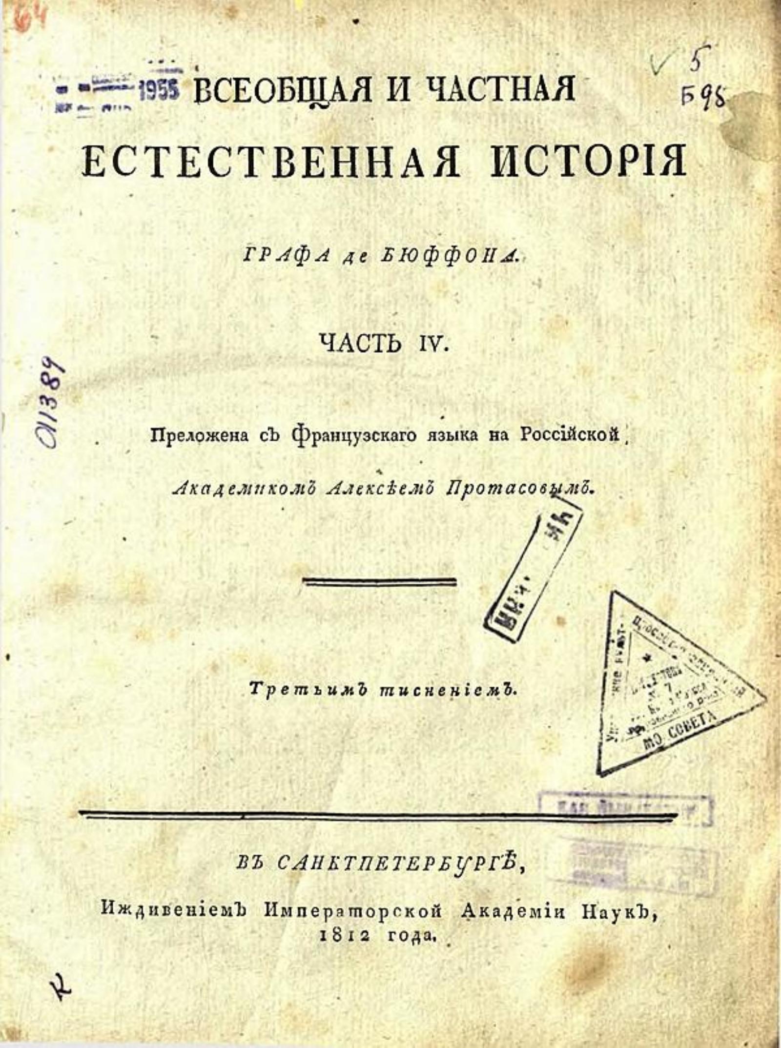 Бюффон, Жорж Луи Леклерк. Всеобщая и частная естественная история графа де Бюффона. — В Санктпетербурге : Иждивением Императорской Академии наук, 1801. Ч. IV / преложена с французскаго языка на российской академиком Алексеем Протасовым. — 1812. — 338 с.