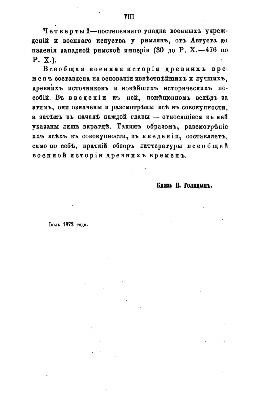 Впервые издана в Петербурге в 1872-1878 гг. Свой капитальный труд «Всеобщая военная история» в 15 томах князь Николай Сергеевич Голицын создал в 1838-47 годах в период профессорско-преподавательской работы в Императорской военной академии, где он руководил кафедрой стратегии и затем — военной истории. На протяжении двадцати лет со времени учреждения академии не существовало учебного пособия на русском языке по военной истории. Голицын, с разрешения академического и высшего начальства, делает первый шаг к восполнению недостатка в военной литературе. Работа Голицына явилась первой в России и Европе попыткой полного систематического изложения всеобщей военной истории и задумывалась автором как руководство к преподаванию и изучению этого предмета. «Всеобщая военная история» представляет собой полный и подробный обзор войн и походов великих полководцев, военно-исторических событий в необходимой связи с современной автору историей: политической, военного искусства, искусства и науки ведения войны и военной литературы. «Всеобщая военная история древних времен» состоит из двух частей. Первая посвящена историческим событиям от древнейших времен до смерти Александра Великого (232 г. до н. э.). Вторая часть рассказывает об истории следующего периода — от смерти Александра Великого до падения Западной Римской Империи (323 г. до н. э. — 476 г. н. э.).