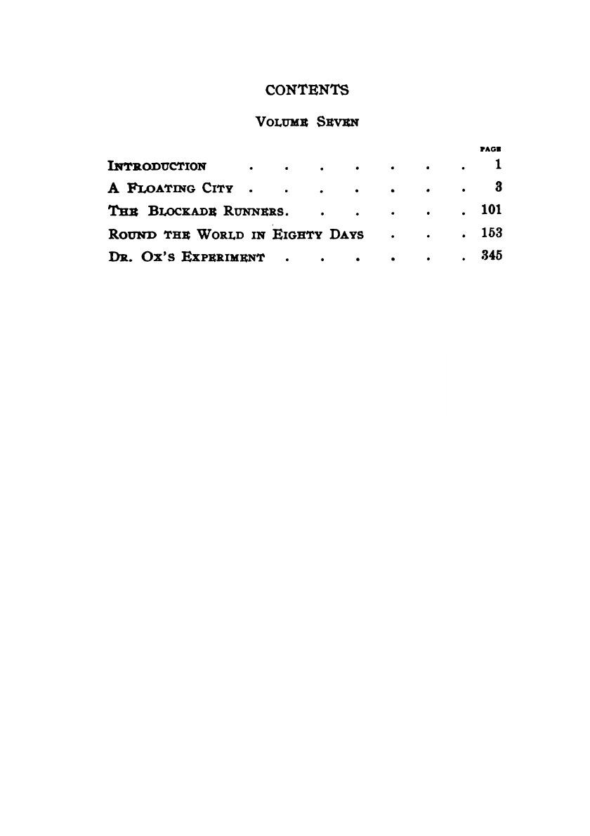 The Vincent Parke set contains 36 stories and short stories, 44 illustrations and a portrait of Jules Verne, consisting of fifteen volumes. This is volume 7 contains: A Floating City; The Blockade Runners; Round the World in Eighty Days; Dr. Ox's Experiment.