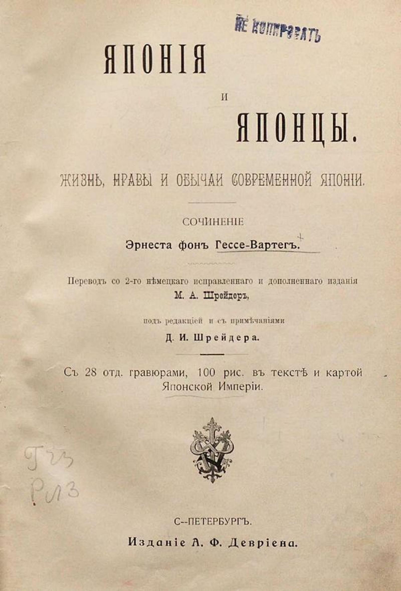 Гессе-Вартег, Эрнст фон (1854–1918). Япония и японцы : Жизнь, нравы и обычаи современной Японии : С 28 отд. грав., 100 рис. в тексте и карт. Япон. имп. / Соч. Эрнеста фон-Гессе-Вартег; Пер. со 2-го нем. испр. и доп. изд. М. А. Шрейдера; Под ред., [с предисл.] и с примеч. Д. И. Шрейдера. — Санкт-Петербург : А. Ф. Девриен, ценз. 1902. — VI, 284 с., 1 л. карт. : ил.; 24.
