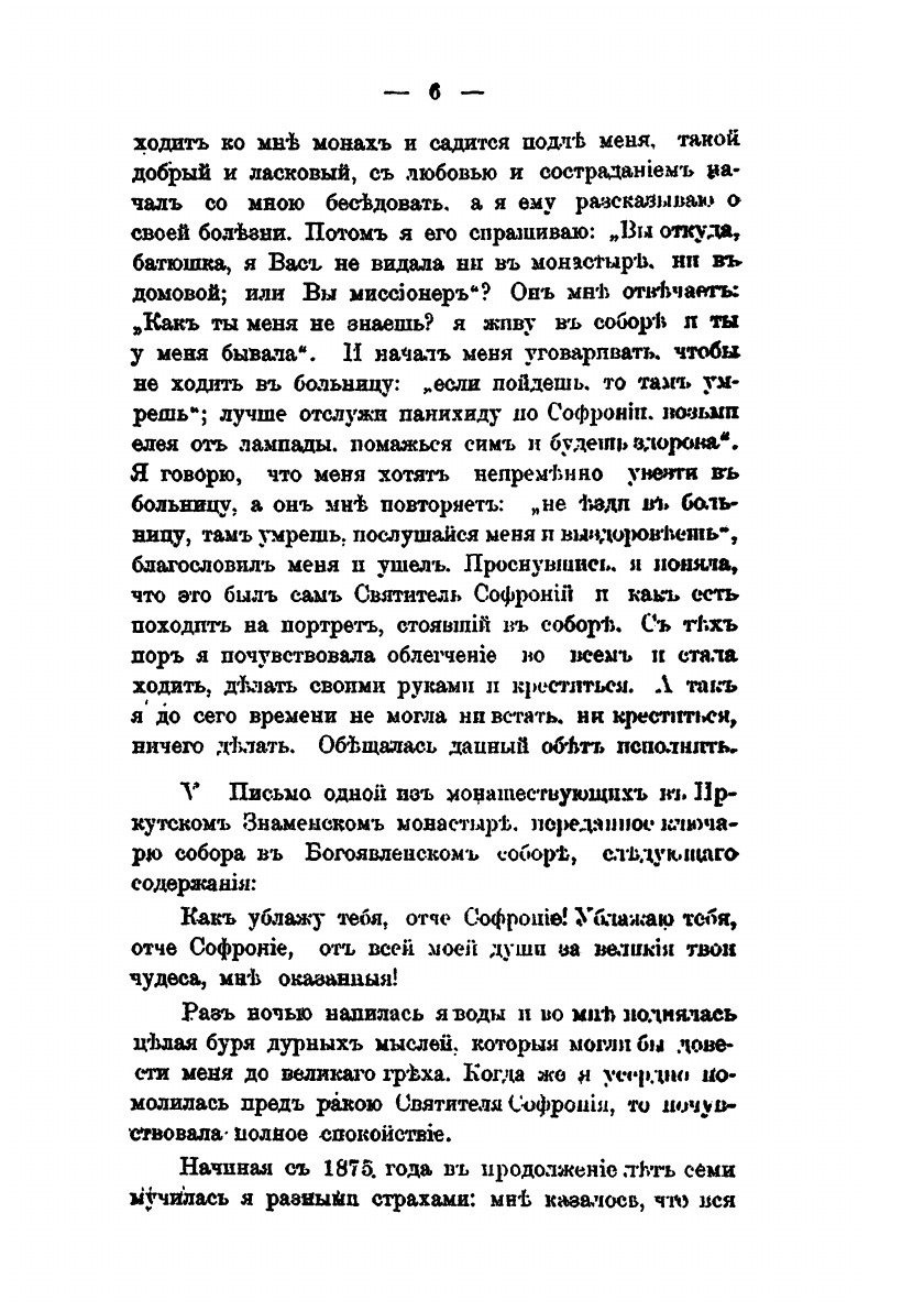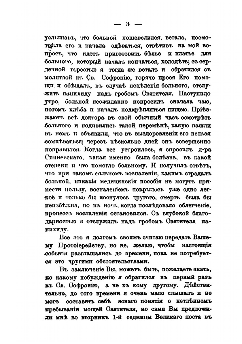 Брошюра “Явления благодатной помощи Святителя Софрония, 3-го епископа Иркутского” содержит описание 65 чудес, проверенных особой комиссией (всего чудес, только записанных и проверенных еще до канонизации Святителя, насчитывалось шестьдесят восемь). В книгу входят свидетельства врачей Клевезаля и Волобуева о некоторых наиболее ярких случаях чудесных исцелений по молитвам Святителя, на основании показаний, данных под присягой.