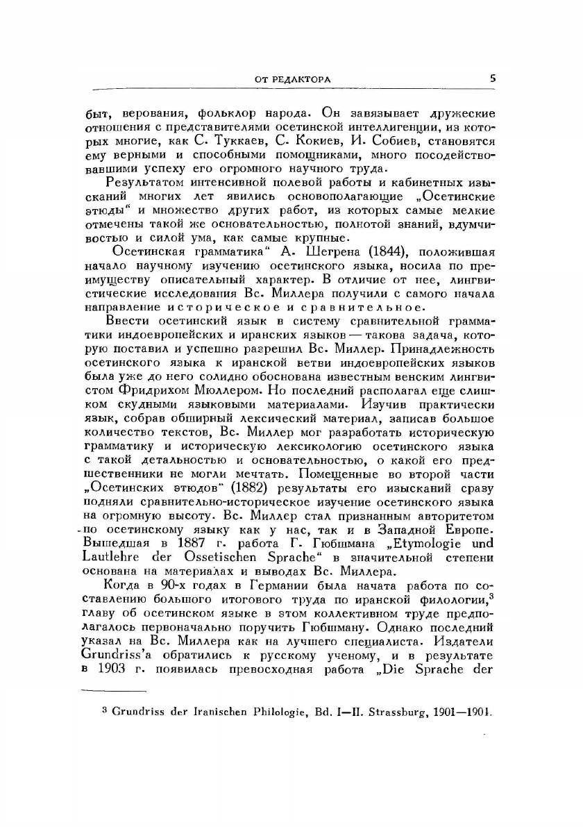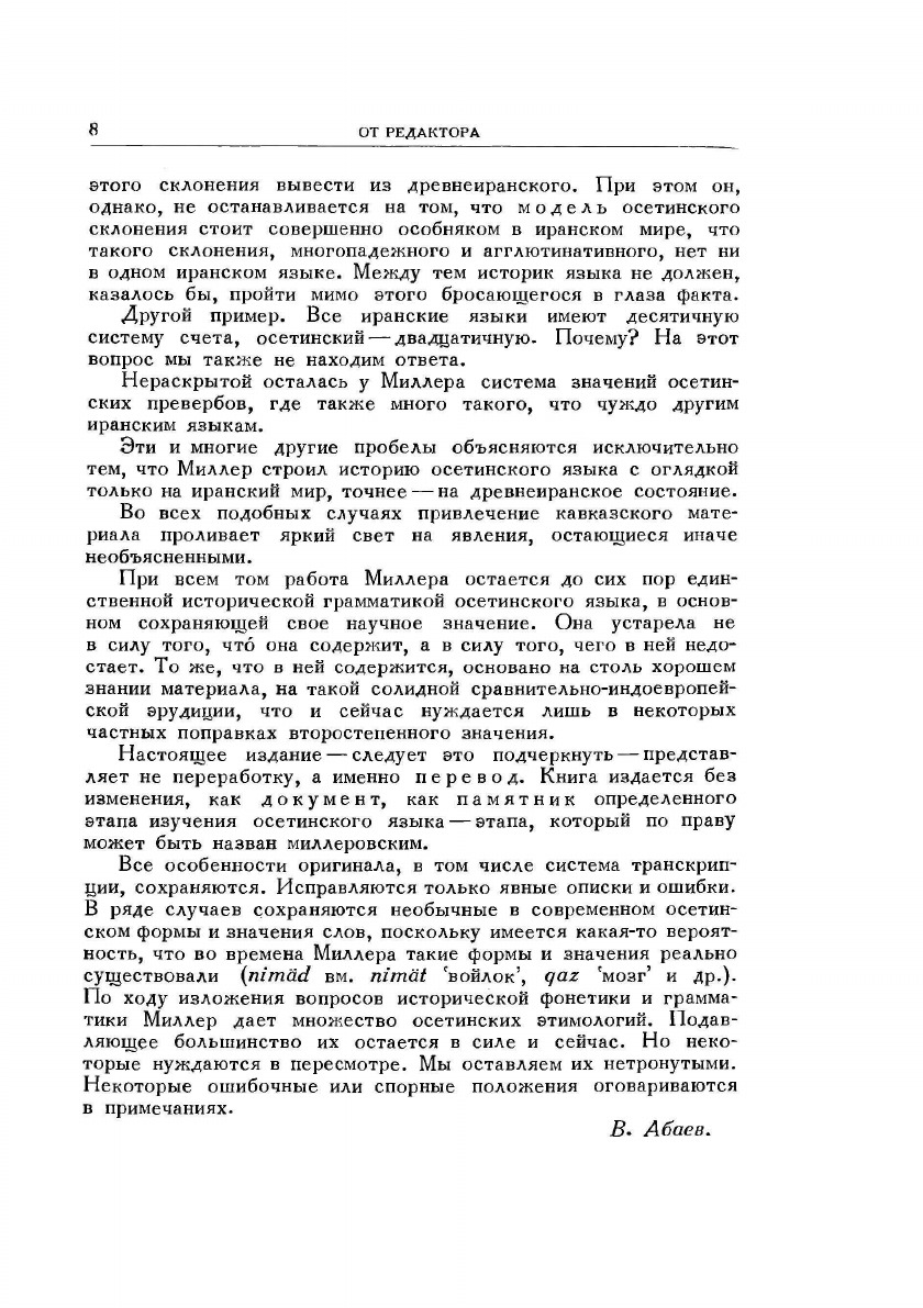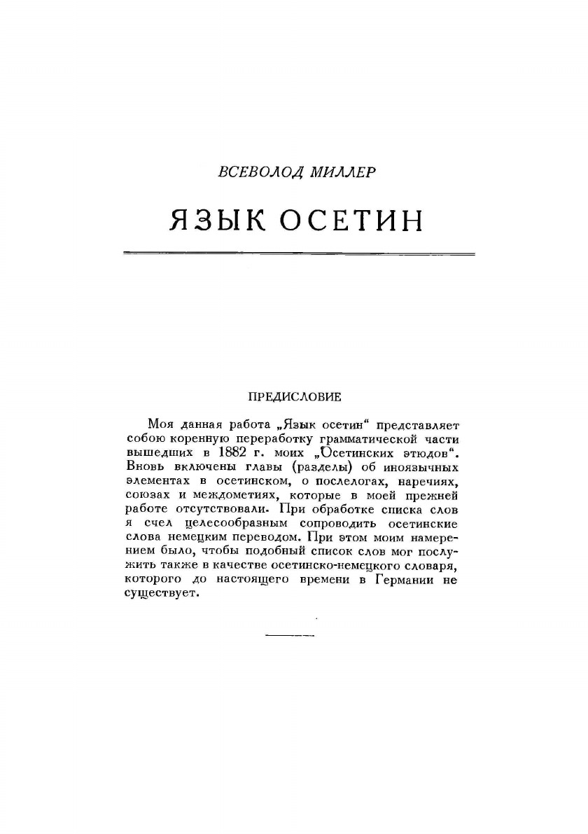 Труд выдающегося русского языковеда-ираниста Вс.Ф. Миллера (1848–1913), впервые издаваемый на русском языке, является первой исторической грамматикой осетинского языка. Несмотря на ряд устаревших положений, книга по сей день представляет значительный интерес и ценность. Предназначена для осетиноведов и шире — для специалистов по иранским языкам.