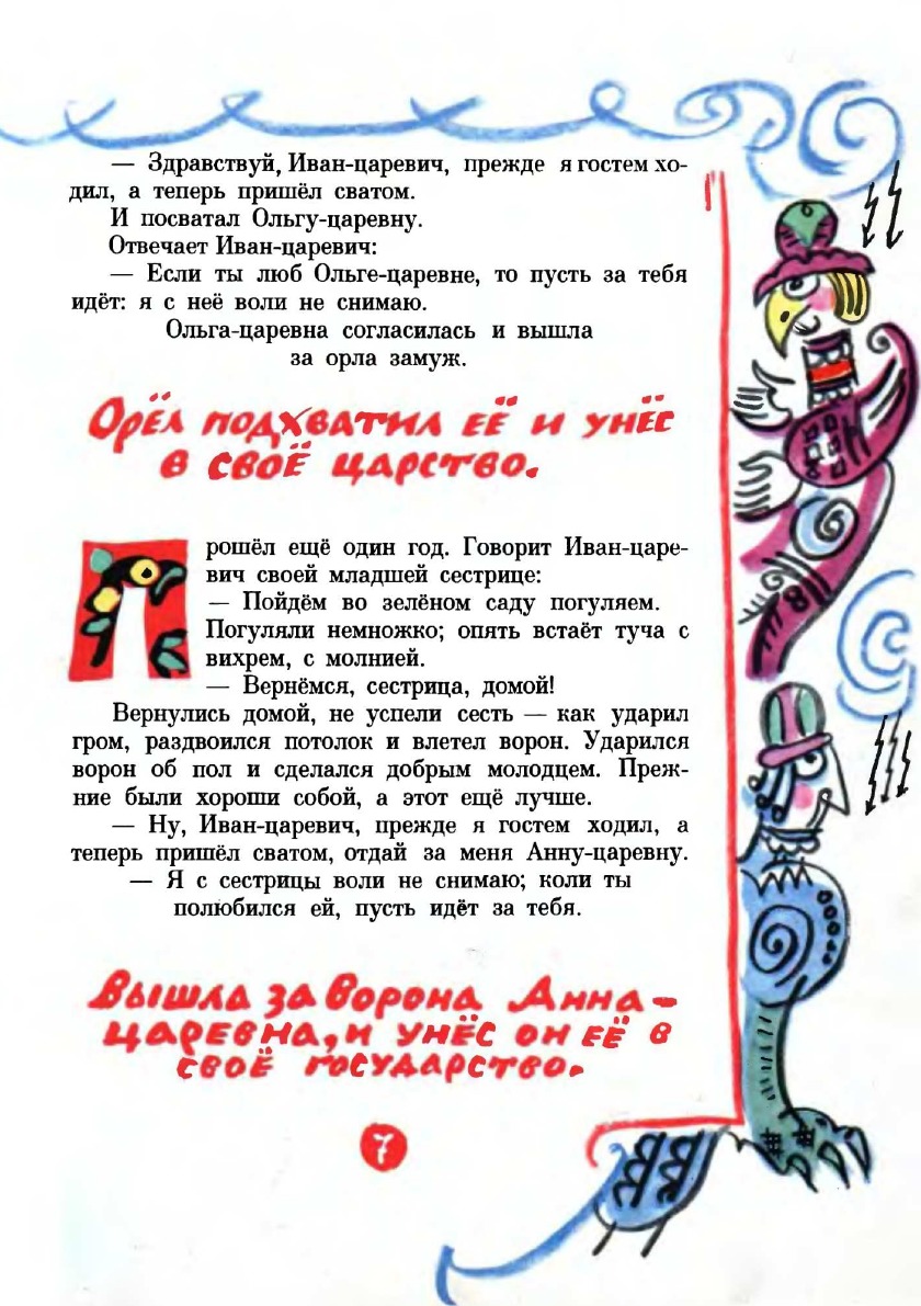Книгу иллюстрировала Т. Маврина.Татьяна Маврина иллюстрировала для детей сказки А. С. Пушкина , русские народные сказки.И с каждым разом в ее книжках плотнее и ярче становился цвет, свободнее и узорнее плоскостной рисунок, фантастичнее и забавнее сказочные персонажи, особенно звери. Татьяна Маврина - единственный советский художник, удостоенный премии имени Г. Х. Андерсена за вклад в иллюстрирование детских книг.